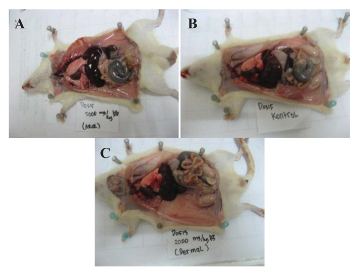 Dermal toxicity was tested on mice treated at the dose of 2,000 mg/kg body weight. Within 14 days of observation, there was no mouse mortality or hair loss. Otherwise, there was no abnormal behavior. The skin of mice was normal throughout the test period and we did not observe any abnormal behavior such as skin irritation, redness or other hypersensitivity symptoms. During test observation, the body weight of mice treated by C-C organic compound solution still increased, as reported in Table 4. The macroscopic observations (Figure 3) on visceral organ groups of mice treated with C-C organic compound solution showed changes in anatomical pathology such as congestion in lungs and liver. However, generally there was no damage to organ or tissue, as determined by macroscopic observation, of the visceral organs.