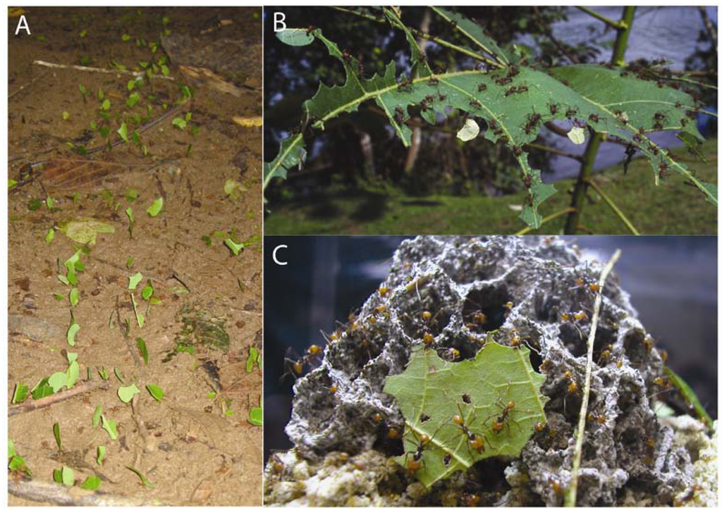 (a, b) Leaf-cutter ants forage on large quantities of fresh foliar biomass. (c) They bring this material into their subterranean nests, where it is integrated into symbiotic fungus gardens they cultivate for food. [Photo credits: A; Jarrod J. Scott, B; Christian R. Linder, used under the GNU Free Documentation License, Version 1.2, C; Austin D. Lynch.].