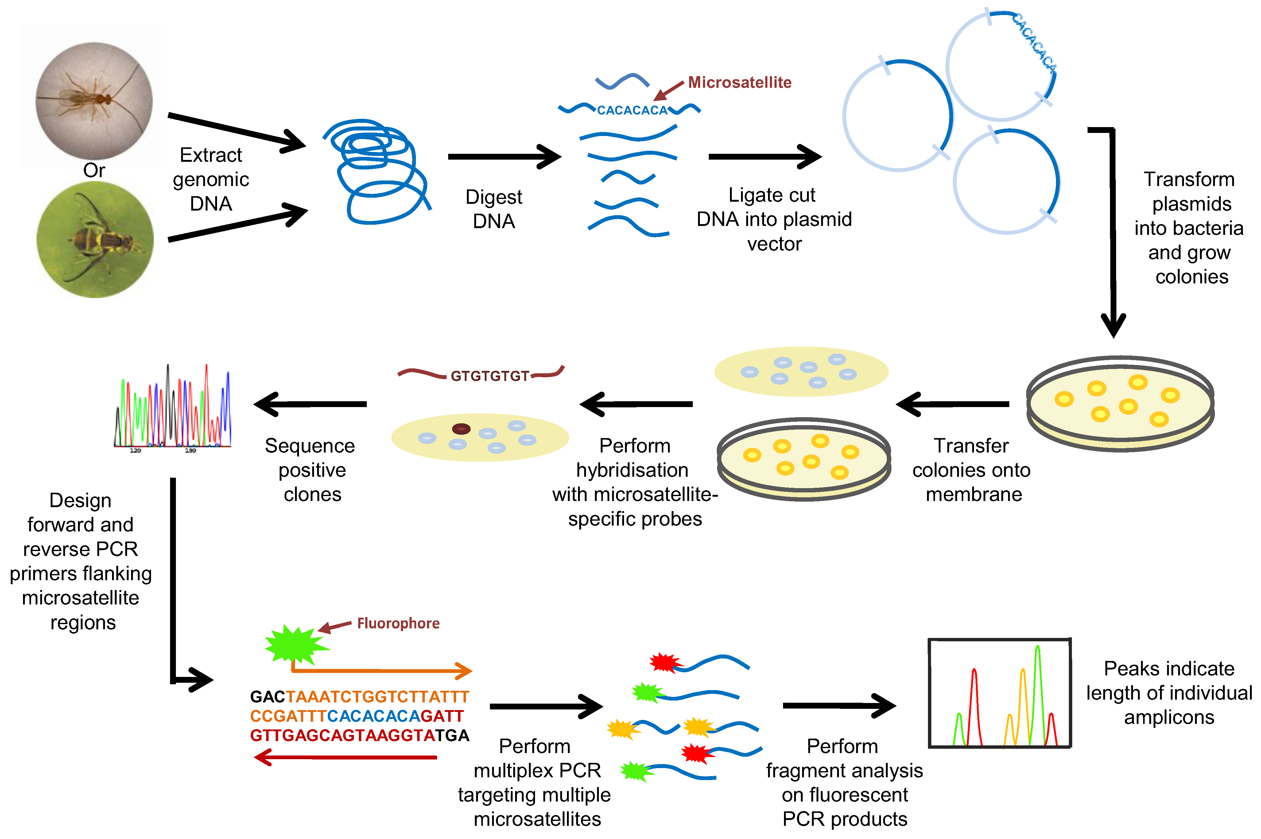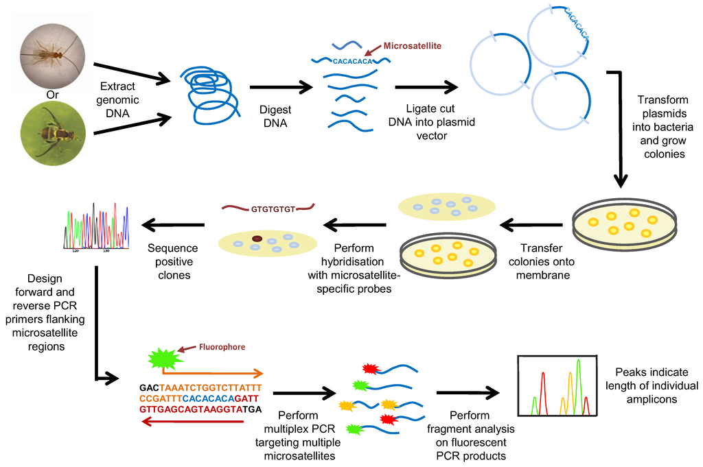 Microsatellites occur at numerous loci within genomes and several of these markers are usually examined simultaneously to generate a fingerprint for a given specimen [114]. Appropriate microsatellite markers were originally identified by screening a genomic clone library with probes complementary to commonly occurring repeat regions (Figure 1). Clones that hybridise to the probe/s are then sequenced to characterise the microsatellite loci and the adjacent DNA sequences. Once appropriate microsatellite markers have been identified, primers that target the specific regions flanking the microsatellite loci are used for PCR amplification. To facilitate DNA fragment analysis, one primer used in the PCR is labelled, typically with a radioactive or fluorescent tag; the optimal length for PCR amplicons is in the range of 100–200 bp. Following amplification, discrimination of these loci is performed by electrophoresis on a polyacrylamide gel which allows for sufficient size resolution of the fragments. Most modern microsatellite analyses are usually carried out with fluorescently-labelled primers, and an automated genotyper is used for fragment analysis (DNA separation and fluorophor detection) (Figure 1). In many instances, microsatellite PCRs are multiplexed and primers are labelled with different fluorophores to allow for more rapid and efficient genetic analysis.