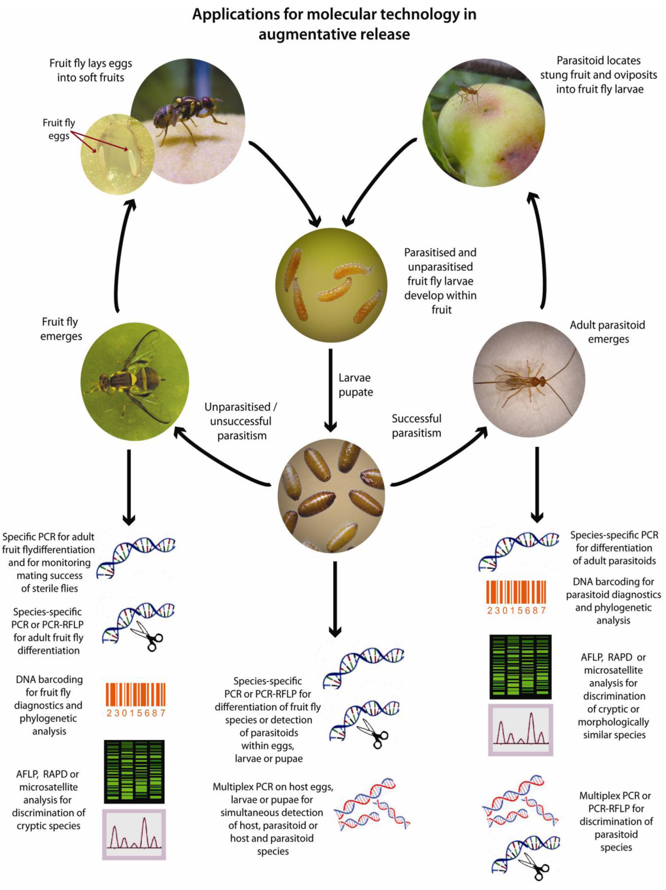 There are several stages within the fruit fly and parasitoid lifecycles where molecular techniques are being, or can be applied (Figure 2). Despite clear advantages in the use of these technologies, molecular methods are not yet widely applied to monitoring the success of augmentative tephritid control programs. Such molecular tools are however becoming increasingly important in clarifying relationships between species, strains and populations of both fruit flies and their parasitoids, which are critical steps in planning successful releases. Indeed, these recent advances are likely to increase the focus on augmentative methods for fruit fly control in the future.