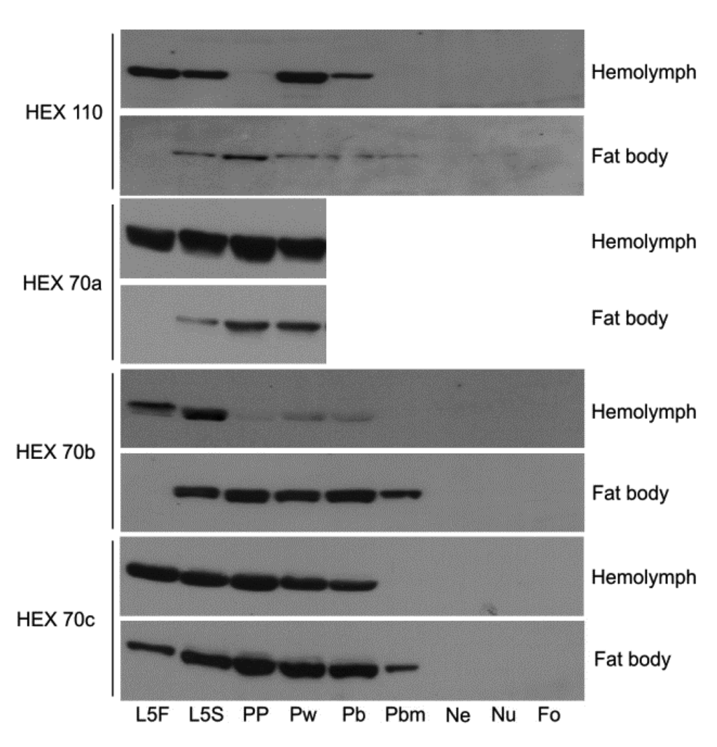 Western blot analysis of the four hexamerins (HEX 110, HEX 70a, HEX 70b and HEX 70c) in the hemolymph and fat body of developing Apis mellifera workers. L5F and L5S: feeding and spinning fifth instar larvae. PP: pharate pupa. Pw: pupa. Pb, Pbm: successive phases of pharate adults. NE: newly ecdysed adult. Nu: nurse bee. Fo: forager bee. The western blots showing HEX 70a in the fat body and in the hemolymph of pharate adults (Pb and Pbm phases) and adults (three days old Nu and 24 days old Fo) were shown previously (see Figure 2 in [28]).