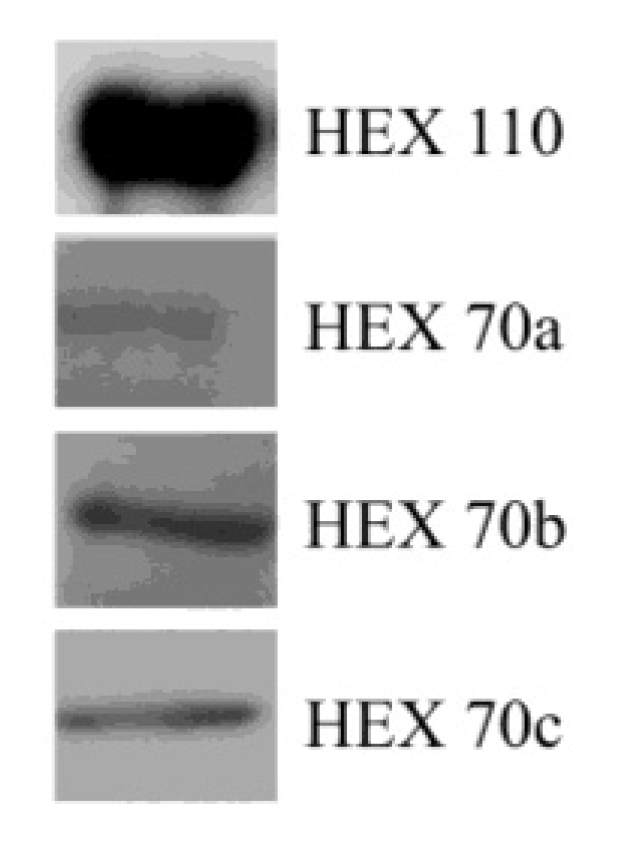 We verified the expression of the four hexamerins in the hemolymph and fat body during precise developmental time points by western blotting (Figure 1). In fifth instar feeding larva (L5F), all hexamerins exist in a larger quantity in the hemolymph than in the fat body, indicating intense secretion to the hemolymph. During the next developmental phase, when the fifth instar spinning larva (L5S) prepares for the metamorphic molt, the abundance of all hexamerins increases in the fat body. Based on what is known about the exchange of hexamerins between the fat body and hemolymph, this increase may denote the resorption of hexamerins into the fat body, via sequestration from the hemolymph. From the L5S time point to the pharate adult phases (Pb, Pbm), the hexamerins still remain relatively abundant in the fat body, although HEX 110 is the less abundant. The abundance of all hexamerins in the fat body decreases to basal levels near the time of adult ecdysis, i.e., at the end of the last pharate adult phase, Pbd (not shown in Figure 1). However, HEX 70a levels increase again in the adults, where this protein persists, even in foragers. The persistence of HEX 70a in the hemolymph of adult workers was first demonstrated by Coomassie Blue stained SDS-PAGE [25]. Since HEX 70a comigrates with the small lipophorin subunit (ApoLp-II) [34], we used the specific antibody to verify and confirm its persistence in adults [28]. This result was reinforced by the detection of HEX 70a transcripts in adult workers from emergence up to 30 days of adult life [28,29].