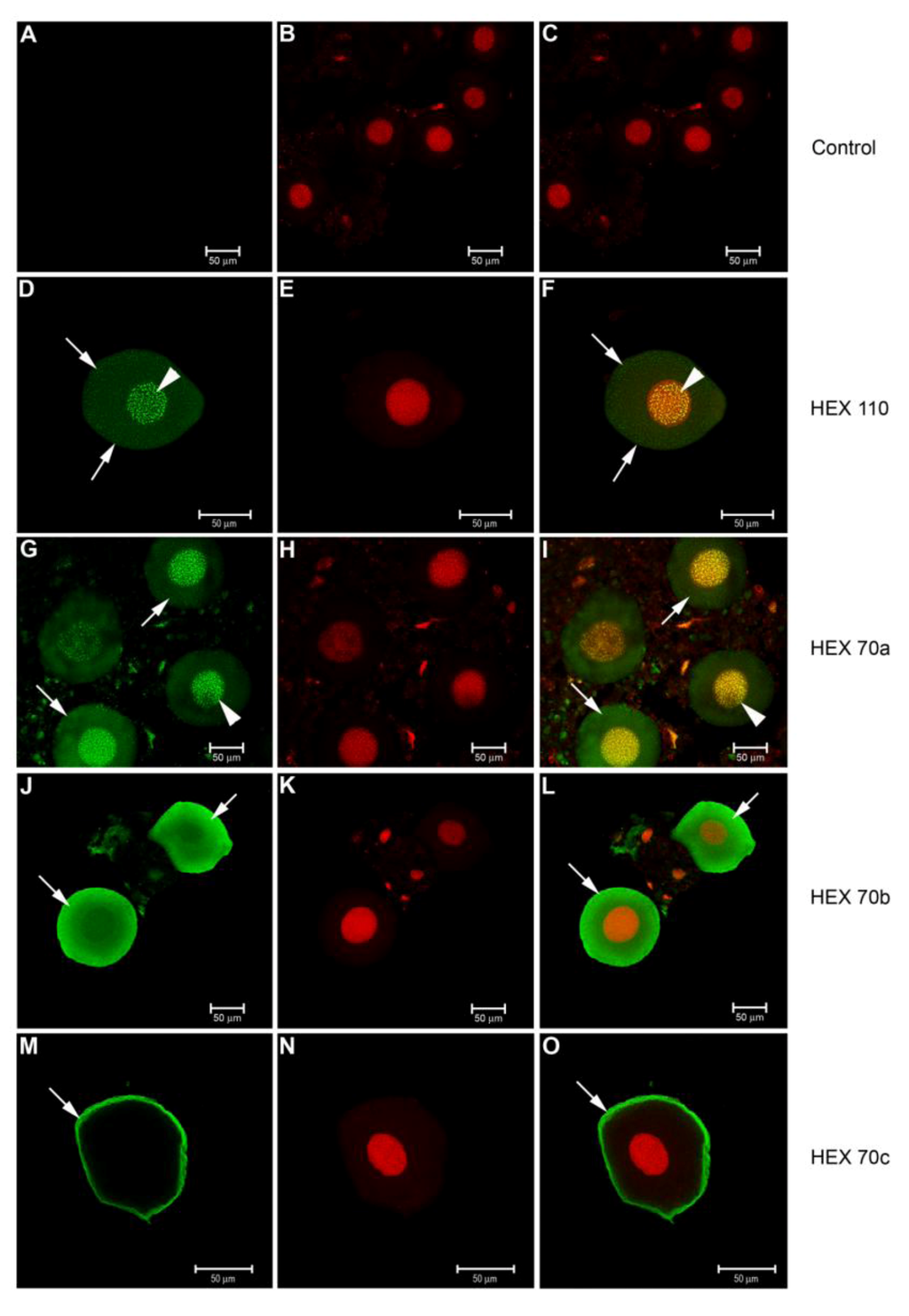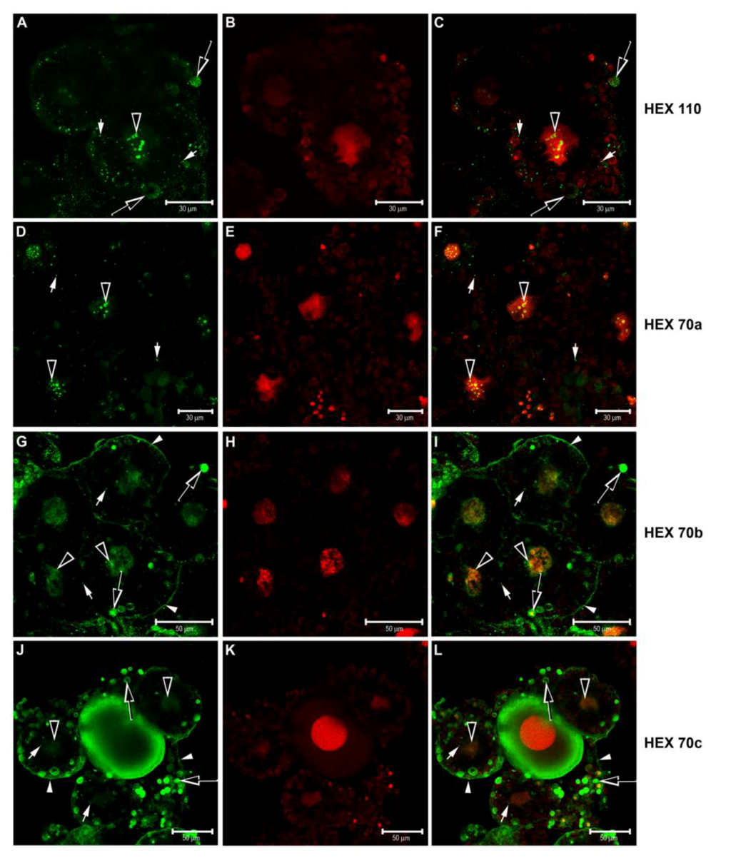 In the trophocytes, foci of HEX 110 (Figure 3A–C), HEX 70a (Figure 3D–F), HEX 70b (Figure 3G–I) and HEX 70c (Figure 3J–L) were evident in the nucleus and in the cytoplasm. The nuclear foci of HEX 110 (Figure 3A,C) and HEX 70a (Figure 3D,F) were more evident than the nuclear foci of HEX 70b (Figure 3G,I) and much more evident than the nuclear foci of HEX 70c (Figure 3J,L). The cytoplasmic foci of all four hexamerins were visualized as dense granules of different sizes or as large cytoplasmic inclusions, similar to the protein granules (heterophagic vacuoles) formed by fusing vesicles containing hemolymph proteins described by a previous study [12]. In the trophocytes shown in Figure 3G, we could see HEX 70b foci regularly localized at the cell surface. Hemolymph proteins have been described to concentrate at the cell surface before endocytosis occurs inside vesicles, which subsequently are separated from the cell membrane to form protein granules [12]. Interestingly, the trophocytes incubated with anti-HEX 70b (Figure 3G) and anti-HEX 70c (Figure 3J) show large granules of different densities near the cell surface, which suggests that they were derived from endocytosis of these hexamerins.