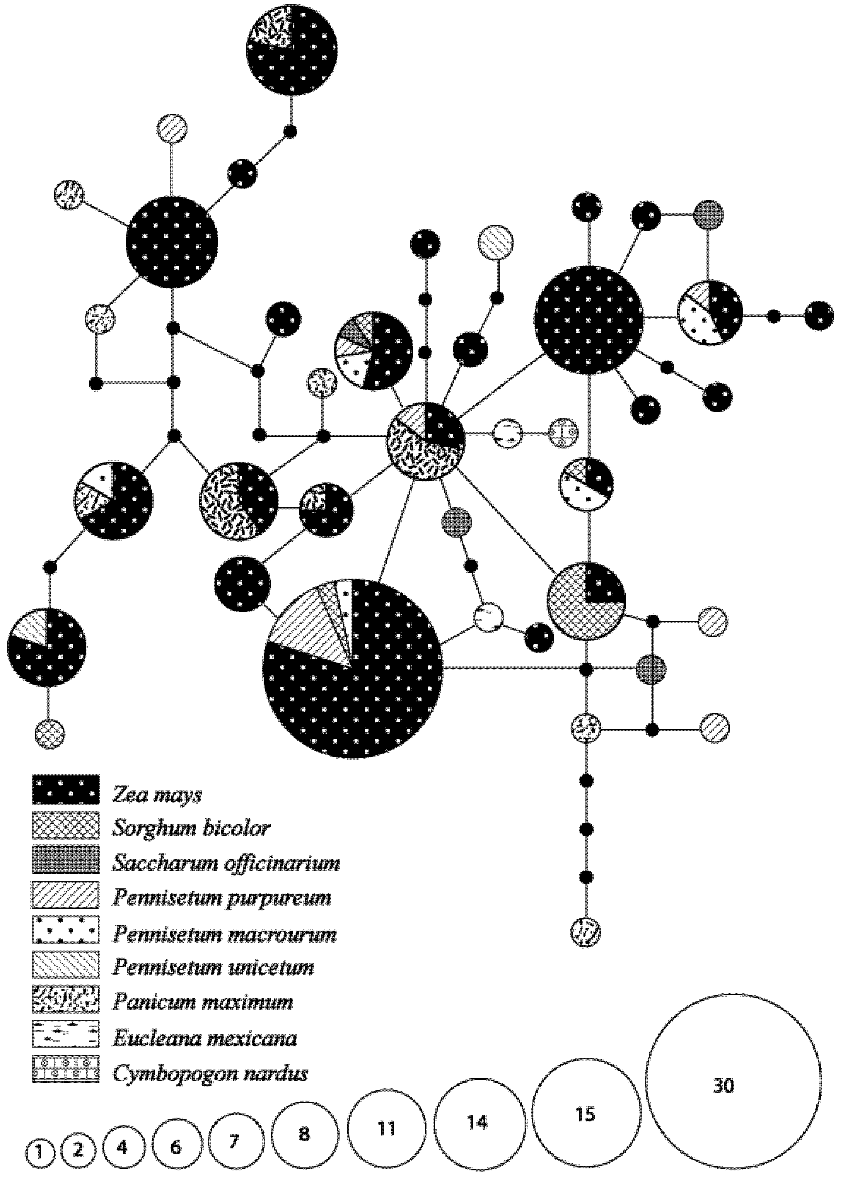 Figure 1. TCS mitochondrial haplotype network of Busseola segeta individuals collected from different host plants in Kakamega. The area of each circle is proportional to the number of samples in each haplotype. Lines represent single nucleotide mutations and black circles represent haplotypes that are not observed in the sample. Different shading patterns represent the different sampled host plants.