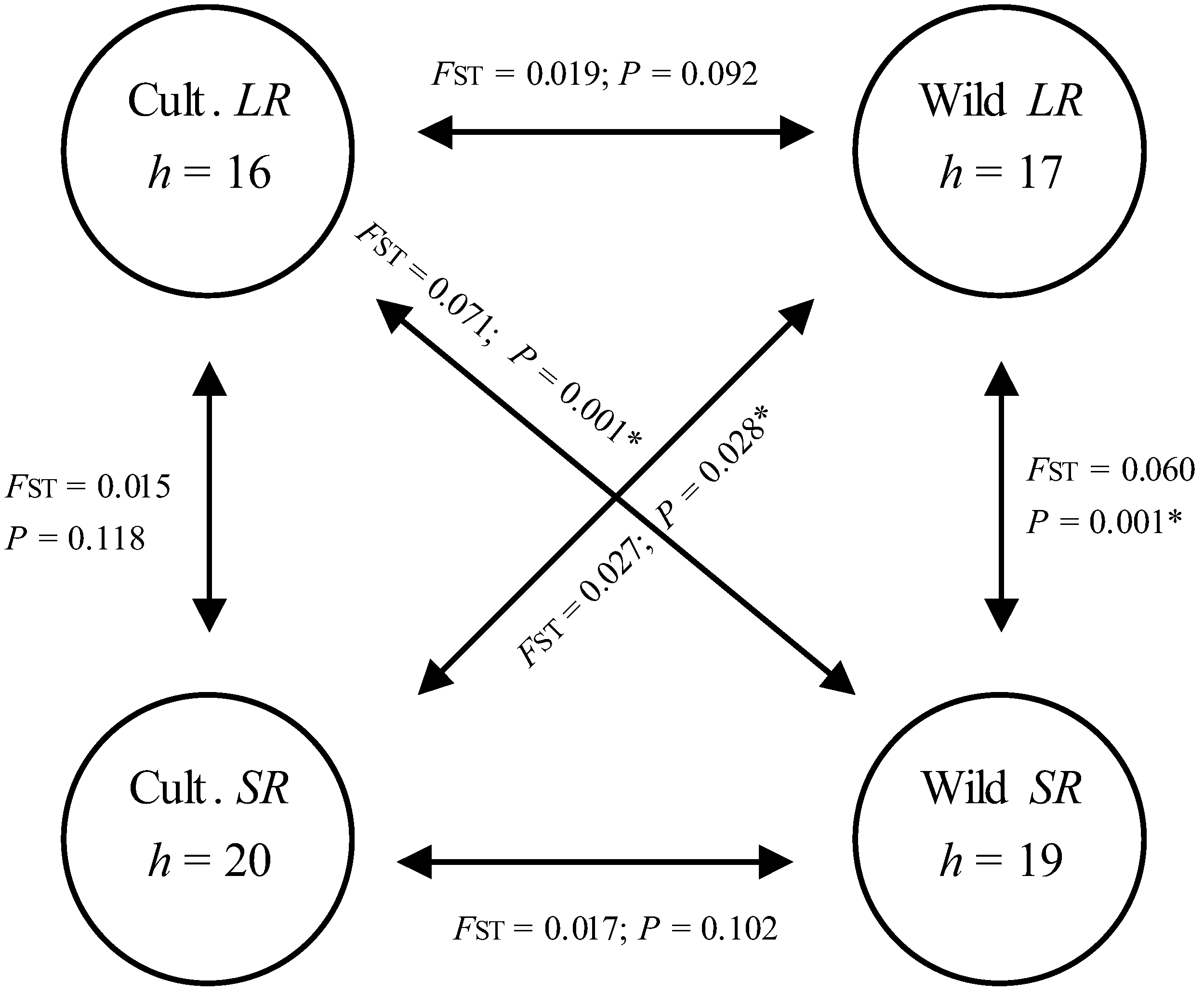 Figure 3. Summary of assumed exchange of haplotypes between habitats and seasons (indicated by arrows). Each unit is assumed to receive and give immigrants to each of the three units. h represents the number of haplotypes found in each unit while FST and P values are the AMOVA results computed between respective units. Asterisks (*) indicate where haplotype compositions between respective units varied significantly (p < 0.05).