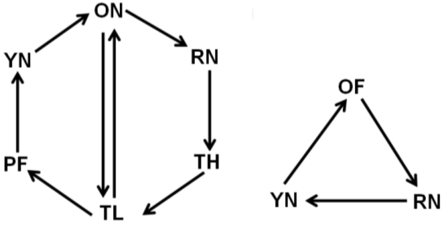 Microarray experimental design. The microarray experiment was designed with 132 arrays in a “round-robin” style. Each arrow represents 6 arrays. YN = young nurse (10 days-old; <1 day flight); RN = reverted nurse (25–26 days-old; 7–9 days flight); OF = old forager (25–26 days-old; 10–12 days flight); TH = typical-aged forager-high flight (19–22 days old; 7–9 days flight); ON = older nurse (19–22 days old; <1 day flight); TL = typical-aged forager-low flight (19–22 days old; 2–3 days flight); PF = precocious forager (8–10 days old; 2–3 days flight).