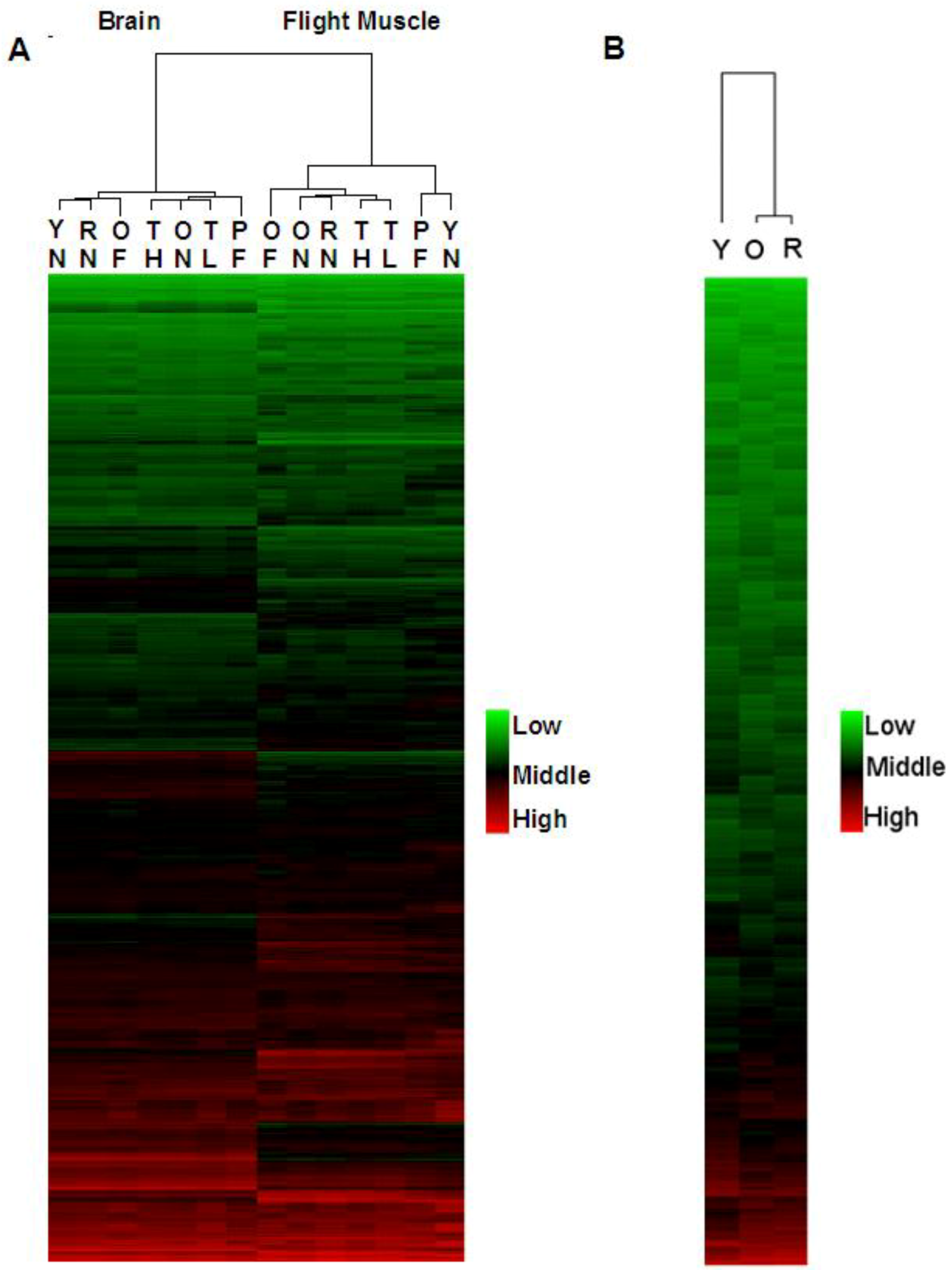 Global expression analysis. Hierarchical clustering was performed to visualize global patterns of gene expression. Replicates were averaged before analysis. Each graph represents over 12,000 transcripts and each row of the graphs represents one transcript. (A) Unique patterns of transcription were seen between groups that represented various ages and behavioral groups with varying amounts of flight experiences. Unique expression patterns were also seen between tissues. (B) Hierarchical clustering reveals groups more closely related in age are most related. YN = young nurse (8–10 days-old; <1 day flight); RN = reverted nurse (25–26 days-old; 7–9 days flight); OF = old forager (25–26 days-old; 10–12 days flight); TH = typical-aged forager-high flight (19–22 days old; 7–9 days flight); ON = older nurse (19–22 days old; <1 day flight); TL = typical-aged forager-low flight (19–22 days old; 2–3 days flight); PF = precocious forager (8–10 days old; 2–3 days flight). Y = young bees (8–10 days-old); O = old bees (25–26 days-old foragers; 19–22 day-old nurses); R = reverted nurse bees (25–26 days-old; 7–9 days flight).