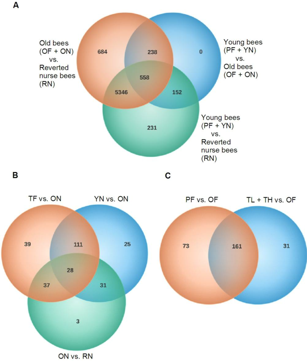 Unique and shared transcripts. Venn diagrams were used to visualize transcripts unique and shared between each group. Numbers represent transcripts differentially expressed (FDR < 0.05). (A) Transcripts differentially expressed between young bees, old bees and reverted nurse bees. (B) Transcripts differentially expressed between nurse bees. (C) Transcripts differentially expressed between forager bees. YN = young nurse (8–10 days-old; <1 day flight); RN = reverted nurse (25–26 days-old; 7–9 days flight); OF = old forager (25–26 days-old; 10–12 days flight); TH = typical-aged forager-high flight (19–22 days old; 7–9 days flight); ON = older nurse (19–22 days old; <1 day flight); TL = typical-aged forager-low flight (19–22 days old; 2–3 days flight); PF = precocious forager (8–10 days old; 2–3 days flight).