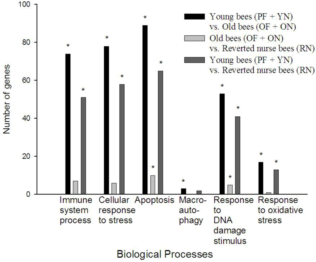 To put the changes in gene expression we identified into a functional context, we performed a gene ontology and biological pathway analysis in ArrayTrack. Figure 4 shows six biological processes relevant to immune function and aging/senescence. In general, young bees compared to old bees had the most differentially expressed transcripts involved in any particular biological process, while young bees (PF and YN) compared to reverted nurse bees (RN) had considerably less differentially expressed transcripts between each other, if any at all. All three comparison groups yielded statistically significant enrichment of response to DNA damage stimulus (GO:0006974) and apoptosis (GO:0006915).