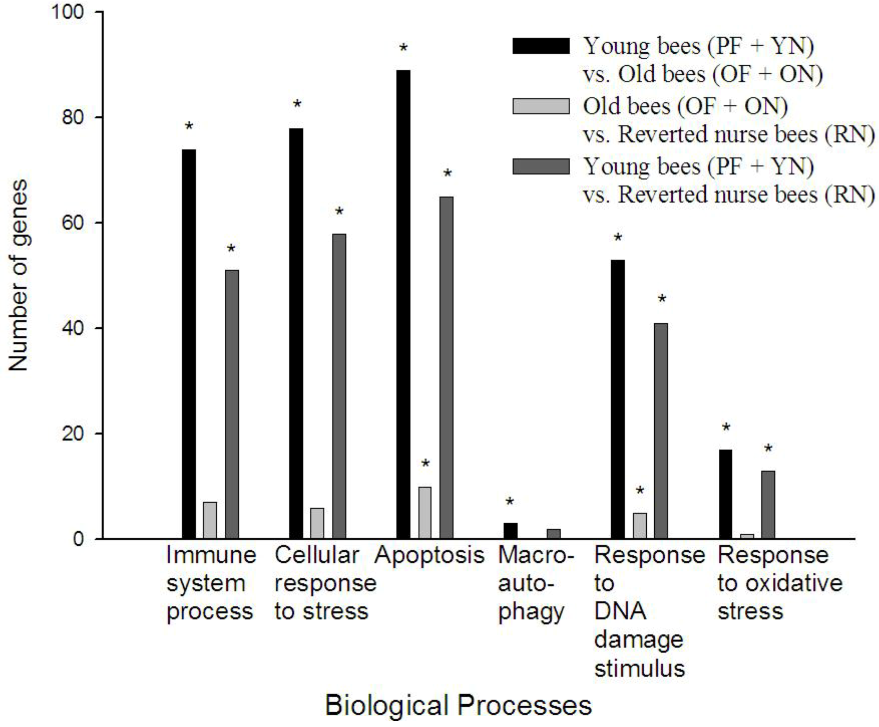 Comparison of biological processes. Gene ontology analysis revealed a series of biological processes involved in immune function and aging/senescence that were enriched in each comparison. The x-axis represents the number of genes differentially expressed for the biological processes represented on the y-axis. Stars represent a Fisher p-value <0.05. YN = young nurse (8–10 days-old; <1 day flight); RN = reverted nurse (25–26 days-old; 7–9 days flight); OF = old forager (25–26 days-old; 10–12 days flight); ON = older nurse (19–22 days old; <1 day flight); PF = precocious forager (8–10 days old; 2–3 days flight).