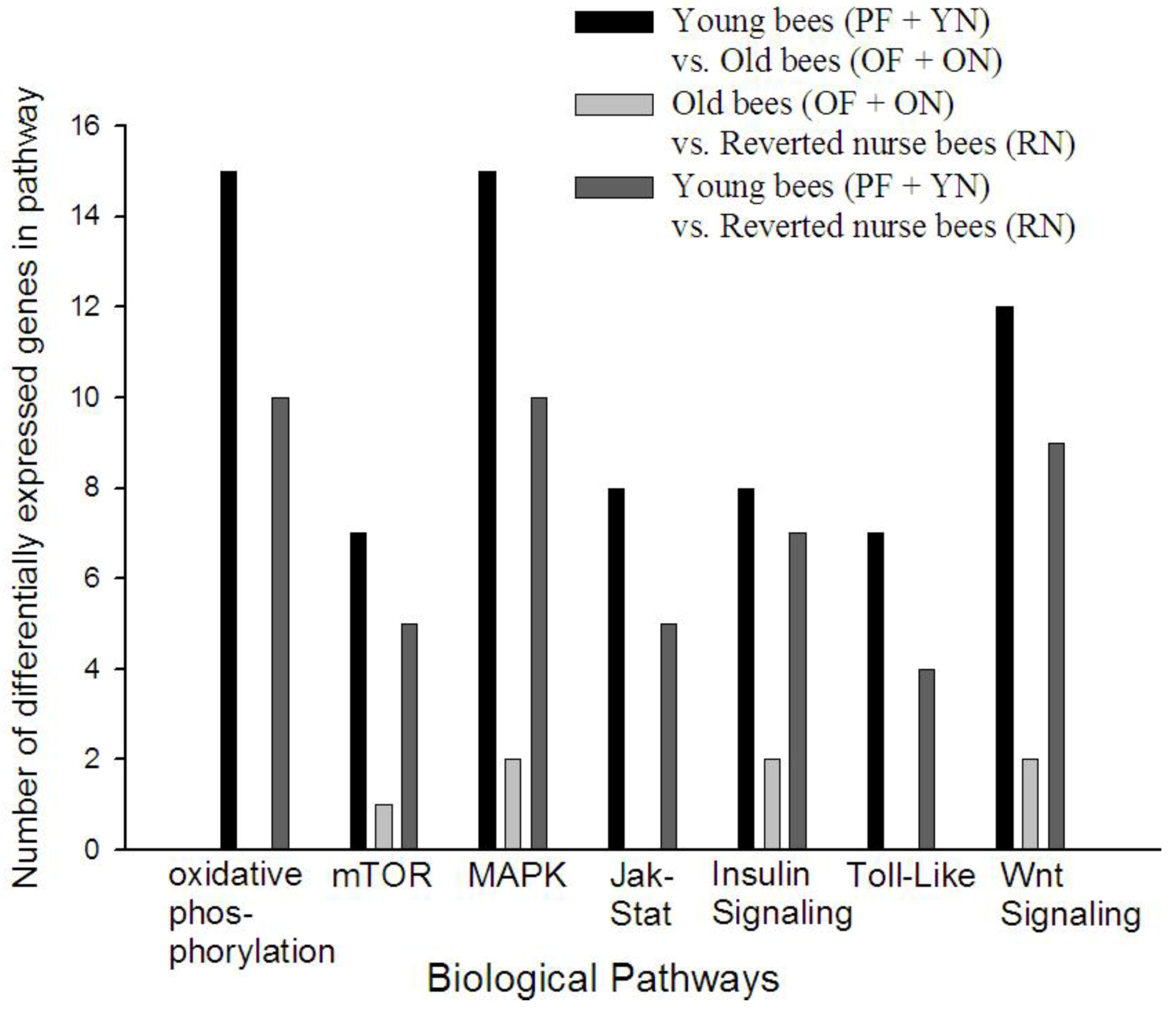 Along with the gene ontology analysis, we conducted a biological/biochemical pathway analysis to putatively identify pathways that differed in the expression of their constituents between age/behavioral groups (Figure 5). The analysis was implemented in ArrayTrack using the KEGG database of pathways. Similar to biological processes, young bees compared to old bees had the most differentially expressed transcripts in each pathway, while young bees compared to reverted nurse bees had far fewer differentially expressed transcripts and in some cases none at all. The oxidative phosphorylation, Jak-Stat, and Toll-like receptor pathway signaling pathways were not represented in old bees (OF and ON) compared to reverted nurse bees (RN), but pathways such as MAPK and mTOR were represented. These results suggest a number of distinct biochemical pathways are activated or repressed with age and the reversion from forager to nurse.