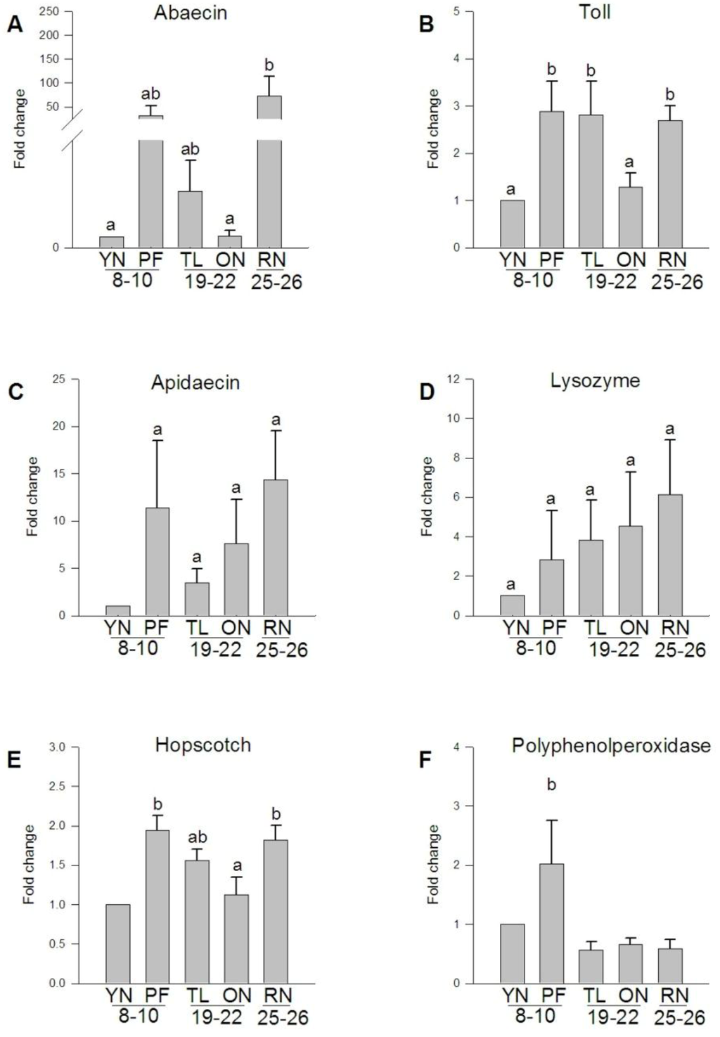 Expression of immune transcripts in A. mellifera flight muscle. Quantification ofmRNA levels of bee specific immune transcripts (A, C), transcripts involved in immune signaling pathways (B, E), and innate immune response transcripts (D, F) revealed differential expression between ages and behaviors. Fold change represents the relative difference compared to one day old bees.