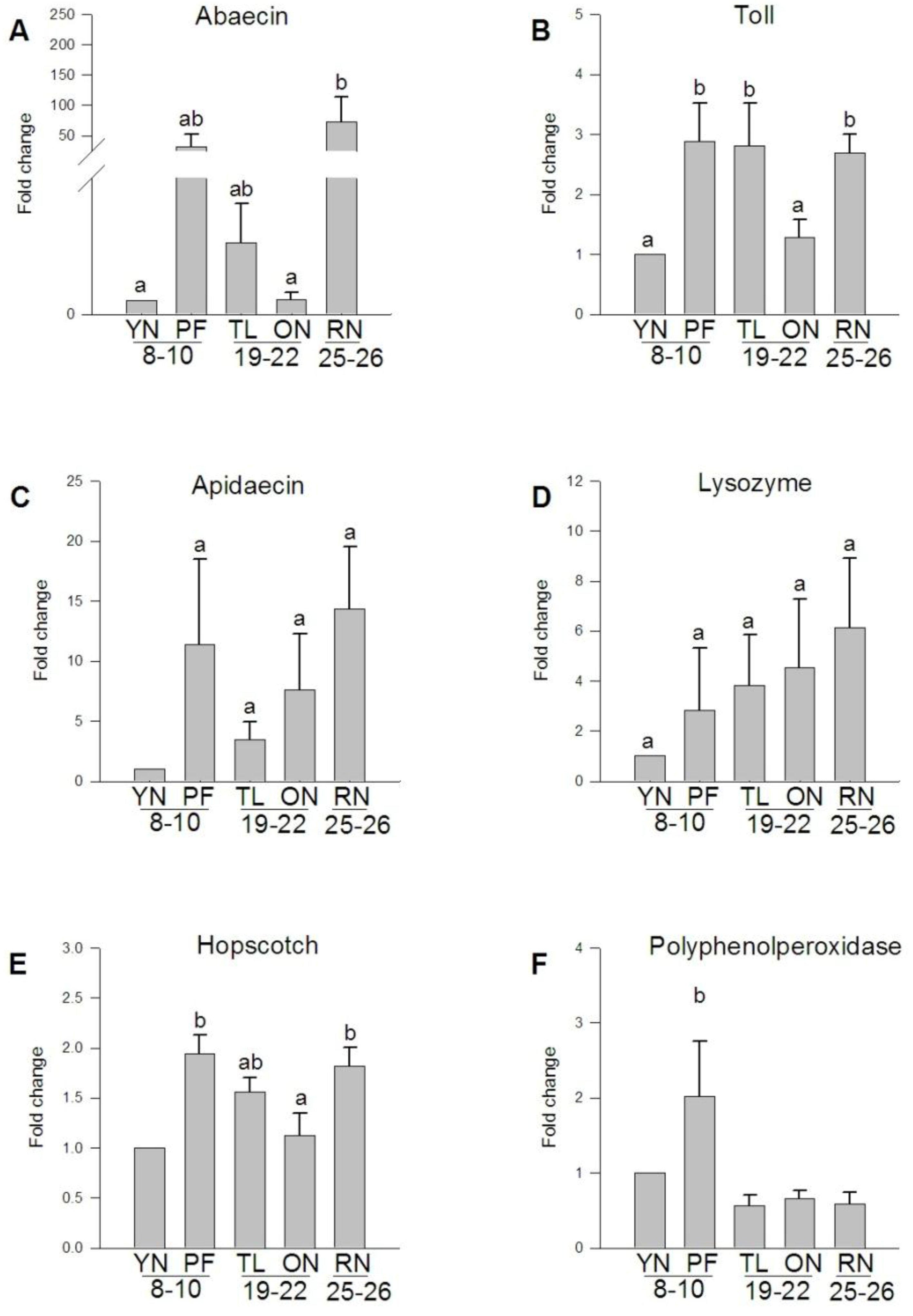 We determined whether different amounts of flight and behavioral reversion have an effect on the expression of a subset of these immunity transcripts identified as differentially expressed in our flight muscle microarray data (Figure 6). We measured mRNA levels in 2 bee-specific immunity transcripts: apidaecin (apid1) and abaecin (LOC406144), 2 immune signaling pathway transcripts: Toll-like receptor (tlr1) and hopscotch (hop), which is part of the Jak-Stat signaling pathway, and 2 transcripts involved in insect innate immunity: lysozyme (lys1) and polyphenoloxidase (ppo) using qRT-PCR. If the loss of immune function were primarily due to age, one would expect to see decreased expression of all of these immune function genes with aging in nurses as well as foragers.