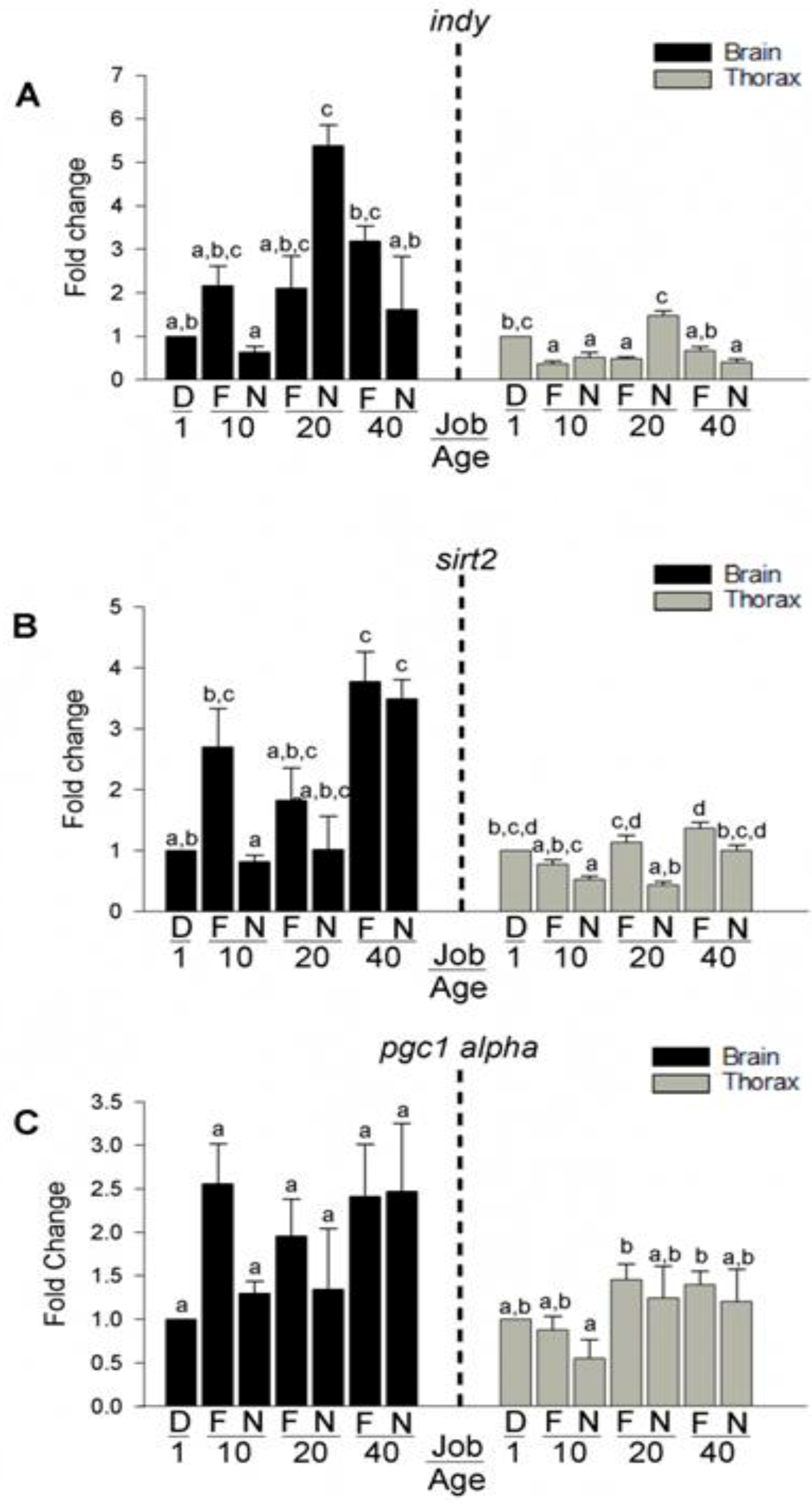 Expression of longevity mediating transcripts in A. mellifera flight muscle and brain.mRNA levels of putative genes involved in aging/senescence were measured in brain tissue and flight muscle. Expression of (A) indy, (B) sirt2, and (C) pgc1alpha revealed distinct expression patterns both between tissues and within tissues. D = single day old bee; N = nurse; F = forager. Fold change represents the relative difference compared to one day old bees.