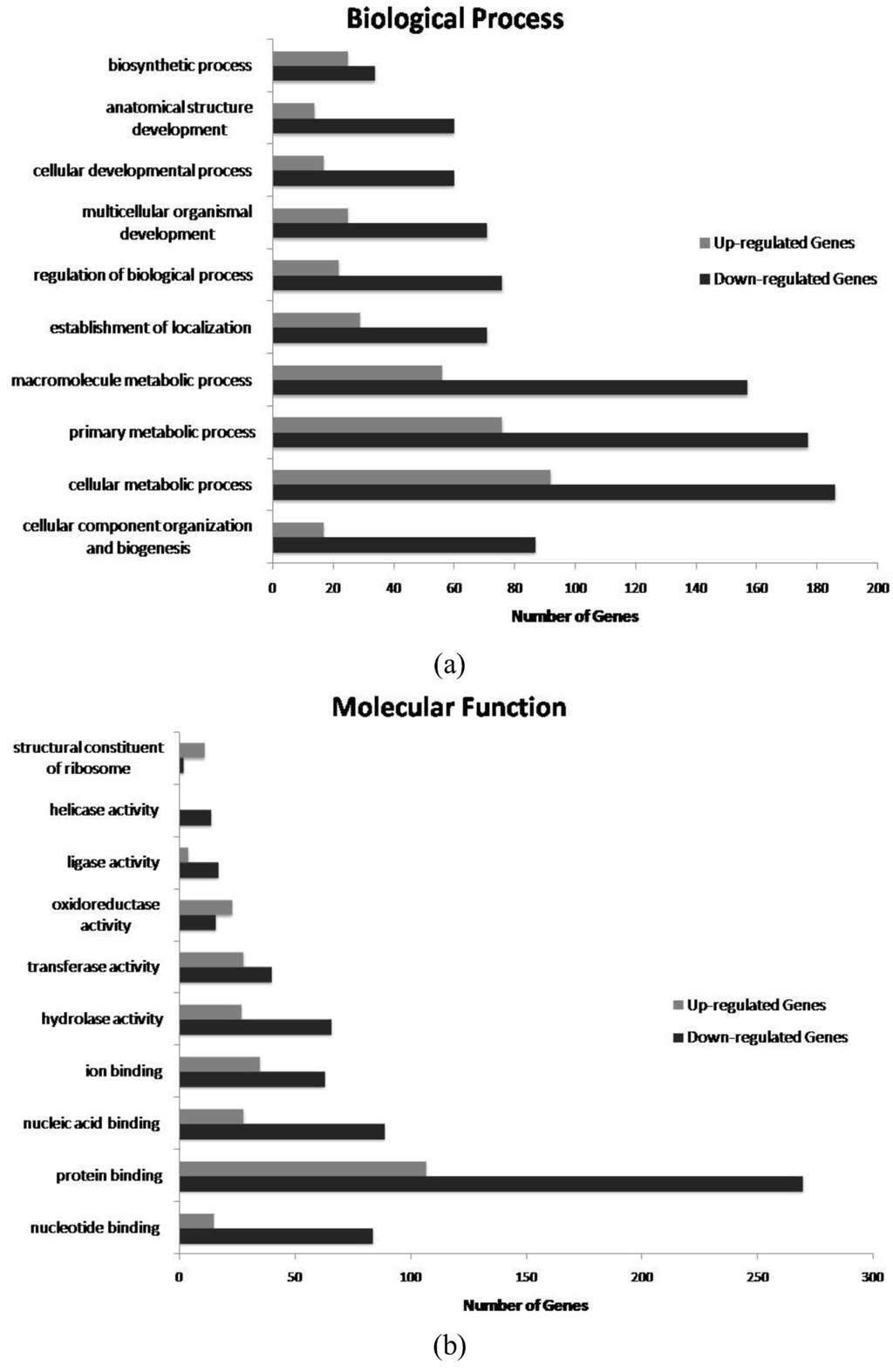 Top 10 Gene Ontology categories representing the major (a) Biological Processes and (b) Molecular Functions affected by dsRNA-GFP treatment during honey bee workers development. For each category (Y axis), the number of down- and up-regulated genes are reported (X axis).