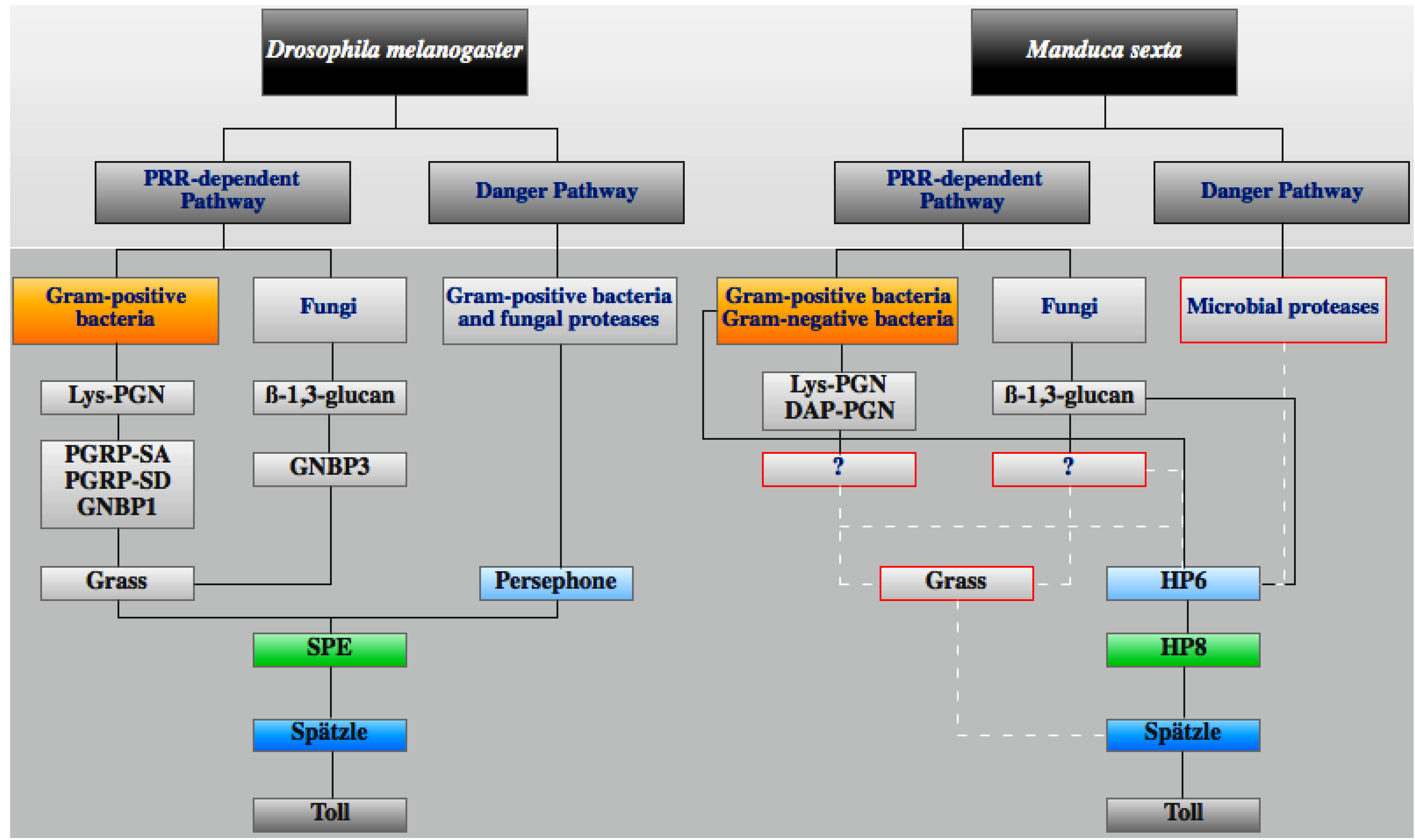 Despite the conservation of certain aspects of the Toll pathway, the extracellular cascades that lead to Spätzle activation may have diverged between D. melanogaster and the two Lepidoptera (Figure 1). For example, in contrast to what is known in D. melanogaster, the M. sexta Toll pathway is activated by gram-negative-associated MAMPs [115,118]. Also, the genome of B. mori lacks 1:1 orthologs of Grass, Spirit and Persephone [54], the D. melanogaster serine proteases responsible for MAMP/PRR-dependent and MAMP-independent cleavage of SPE (Figure 1). Progress has been made in identifying a M. sexta proteolytic cascade that results in processing pro-Spätzle into its active C-terminal domain (C-108). The direct cleavage is mediated by hemolymph proteinase (HP) 8 [11,13], a homolog of D. melanogaster SPE [119], In turn, HP8 is processed into its active form by HP6. HP6 is most similar to D. melanogaster Persephone protease, which activates SPE in response to MAMP-independent stimuli [110,113]. This hemolymph proteinase is activated in response to Gram-positive or Gram‑negative bacteria and in response to ß-1,3-glucan [119]. However, the PRRs and proteolytic cascade that transduce MAMP signals to AMP induction are unknown (Figure 1).