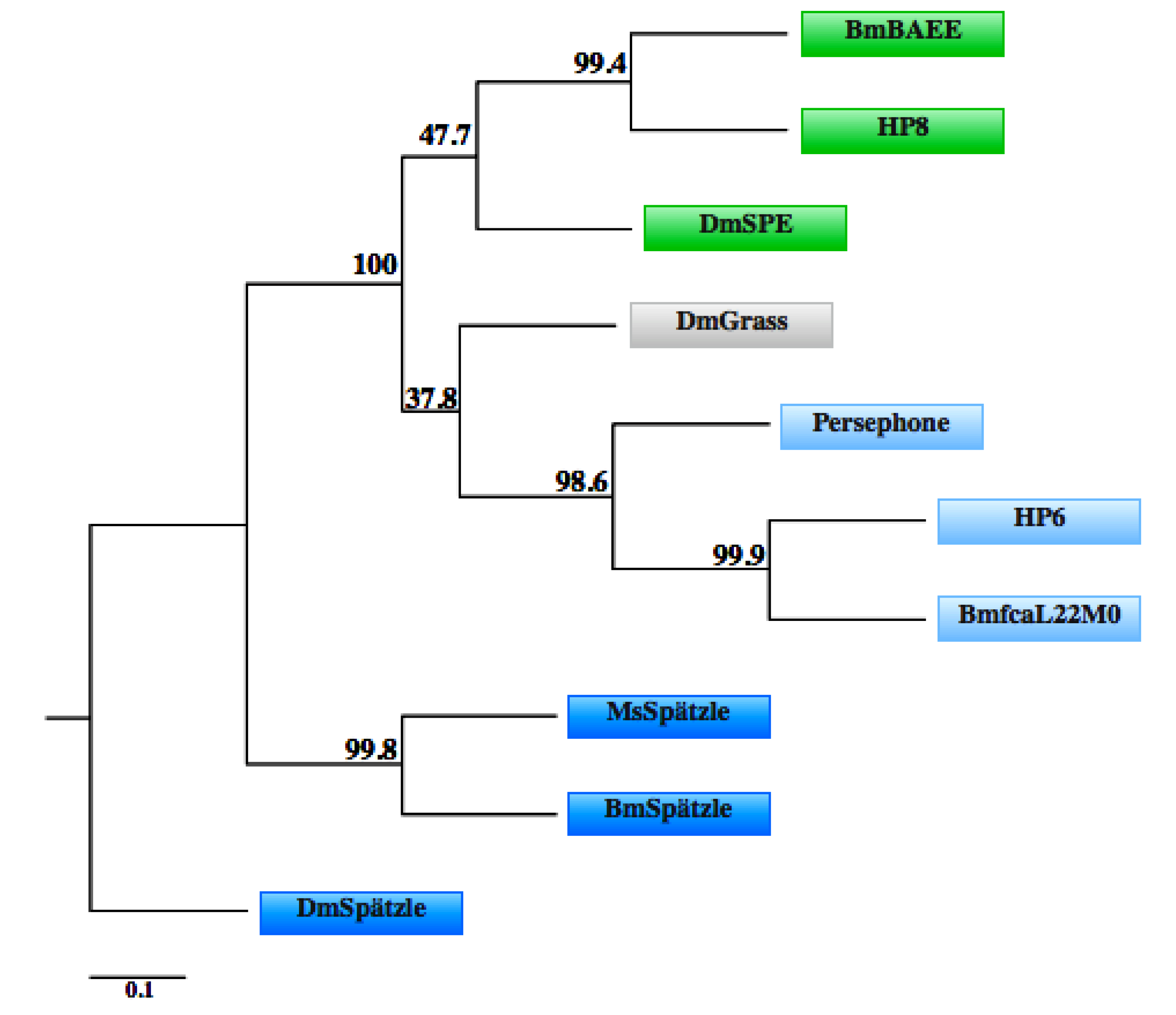 Phylogenetic relationships among serine proteases involved in Toll pathway activation. Sequence alignment and tree construction were performed using the amino acid sequence of D. melanogaster (Dm) Grass (Q86PB3), SPE (NP_651168.1), Persephone (Q9VWU1) and Spätzle (NP_524526.1); M. sexta (Ms) HP6 (AAV91004.1), HP8 (AAV91006.1) and Spätzle (ACU68553.1); and B. mori (Bm) fcaL22M01 (AK384444), BAEE (H9J6N1), and Spätzle (NM_001114594). Bm serine proteases were identified by TBLASTN [120] analysis the Bm genome for homologs of Ms serine proteases. The roles of these Bm proteins in Toll pathway activation have not been shown experimentally. One thousand bootstrap repetitions were performed to estimate the reliability of the tree; the percent values obtained are indicated on the nodes. Sequence alignment was performed using Clustal Omega [121,122] bootstrapping analysis, matrix calculation, matrix transformation were conducted by the Fitch-Margoliash method and the combination of the 1,000 resulting trees was identified using the Seqboot, Protdist, Fitch and Consense programs within the Phylip phylogenetic analysis package [123]. The phylogenetic tree was constructed using Phylodendron software version 0.8d, by D.G. Gilbert [124]. The phylogenetic relationships observed are consistent with those previously published [116,119]. Colored boxes for each protein match those presented in Figure 1.