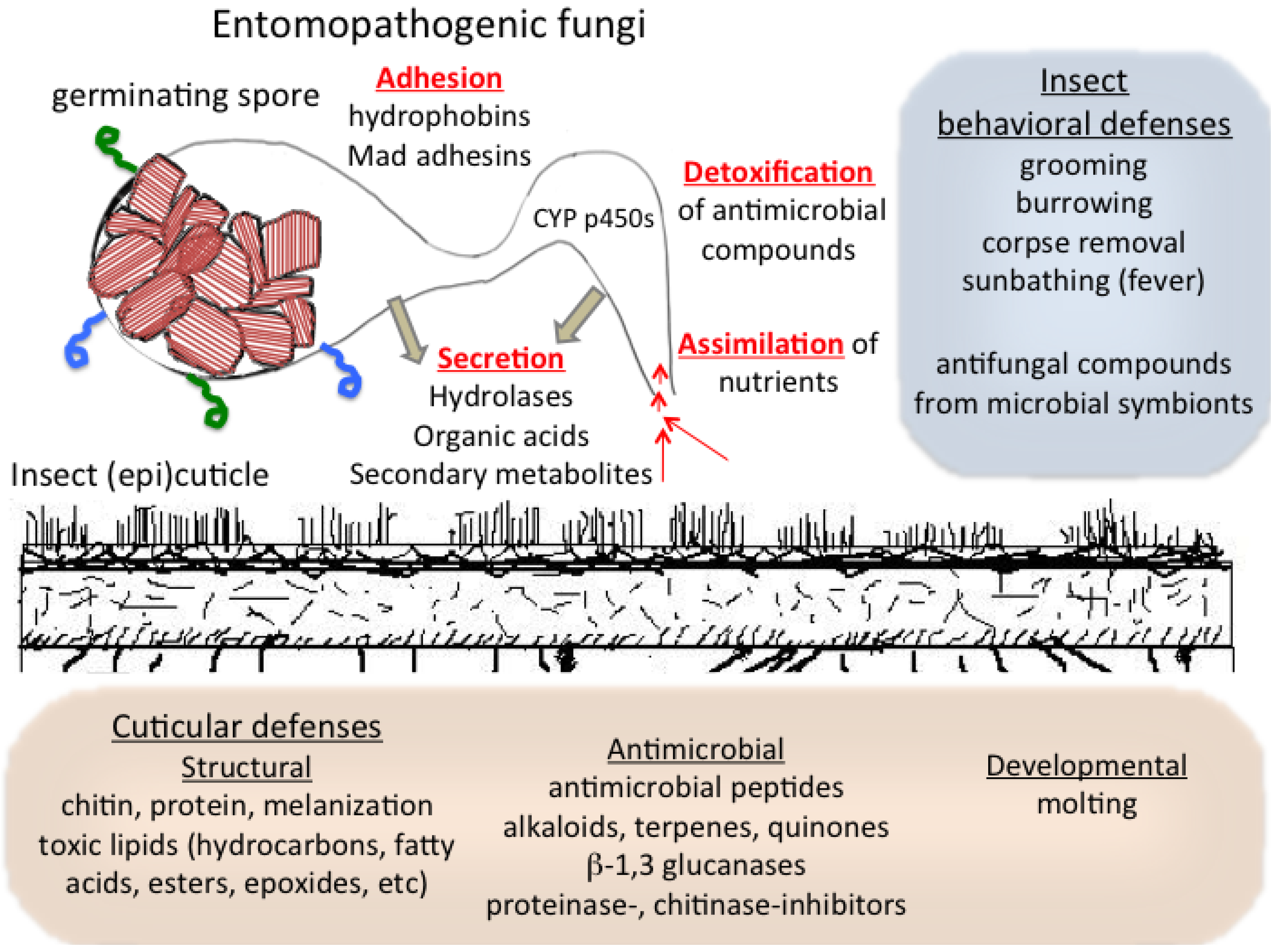 Microbial pathogens of insects have evolved a wide range of strategies for overcoming the formidable defense systems that insects, in turn, continue to evolve in order to fend off such attempts at infection. The selective pressures on the pathogen and the target host have led to a co-evolutionary arms race that is increasingly being recognized as having led to some startling outcomes. Modern exploration of entomopathogenic fungi began with the work of Agostino Bassi (1773–1856), whose observations on the fungal-mediated mal de segno or white muscardine disease of silkworms led to one of the first germ theories of disease [1]. This review will focus on advances in examining the interactions of broad-host range entomopathogenic fungi with the insect (epi)-cuticle, limiting consideration to a subset of insect pathogens in which such interactions are an integral part of the infection process. From a teleological perspective, keeping pathogens at bay at the outermost surface (i.e., epidermis or in the case of insects, the cuticle or epicuticle) would seem to be preferable since it would maximize the probability of survival while minimizing the metabolic costs of a defense response and the chances for an infection to spread throughout the organism. Although certainly a vital component of an insect’s defense response, limiting pathogens on the surface, would imply that the immune system might represent more of a second and ultimately final effort at fighting infection of certain pathogens (or at least prolonging survival to reproduction) than the cuticular defenses. Thus, the insect cuticle along with behavioral avoidance, exclusion or removal of infected nest-mates, especially in social insects, likely represent the two boundary defenses that shape and determine the outcomes of interactions between entomopathogenic fungi and target hosts. However, whereas the immune system has garnered much attention, the importance of the cuticular (and behavioral) defenses remains under-examined. Knowledge concerning insect boundary defenses is vital to deciphering the factors that contribute to the virulence of entomopathogenic fungi. In this regard, although still limited, an increasing amount of research is suggesting that the cuticular surface is a major source for the adaptation of these fungi towards insect hosts and vice versa, i.e., entomopathogenic fungi are an important source driving insect cuticular adaptations. Such information can also be used to define characteristics for understanding the complex interactions that can lead to failure of entomopathogenic fungi as biocontrol agents and the often seen discrepancies between laboratory and field experiments, hopefully leading to new insights aimed towards increasing the efficacy of mycoinsecticides as part of Integrated Pest Managements (IPM) practices.