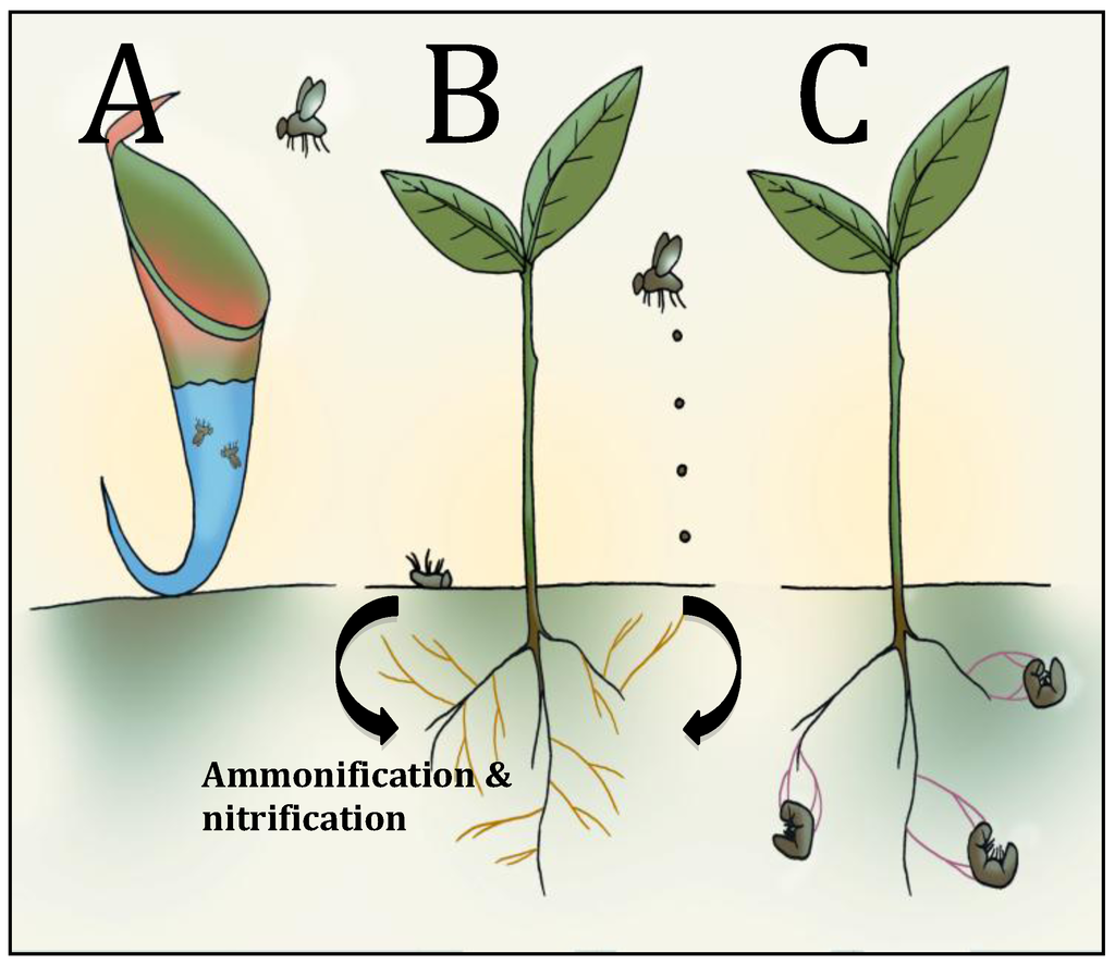 This below ground loss of nitrogen can however partially be counterbalanced through the incorporation of insect-derived nitrogen back into plants. Plants are able to accomplish this through: (1) direct ingestion of insects; (2) indirect transfer of insect-derived nitrogen (i.e., decomposing insect cadavers or insect frass) through bacterial or fungal ammonification and nitrification, or transfer of this nitrogen through symbiotic mycorrhizal fungi; or (3) a direct transfer of insect-derived nitrogen through a partnership with endophytic insect pathogenic fungi.