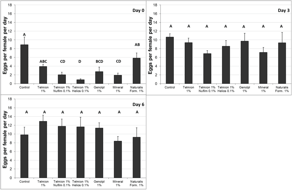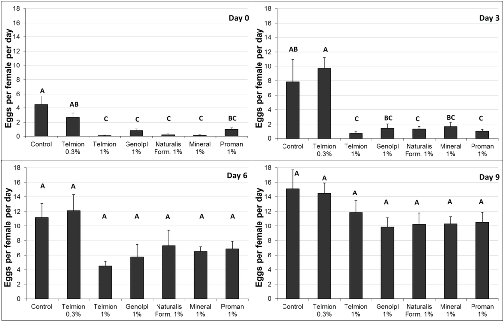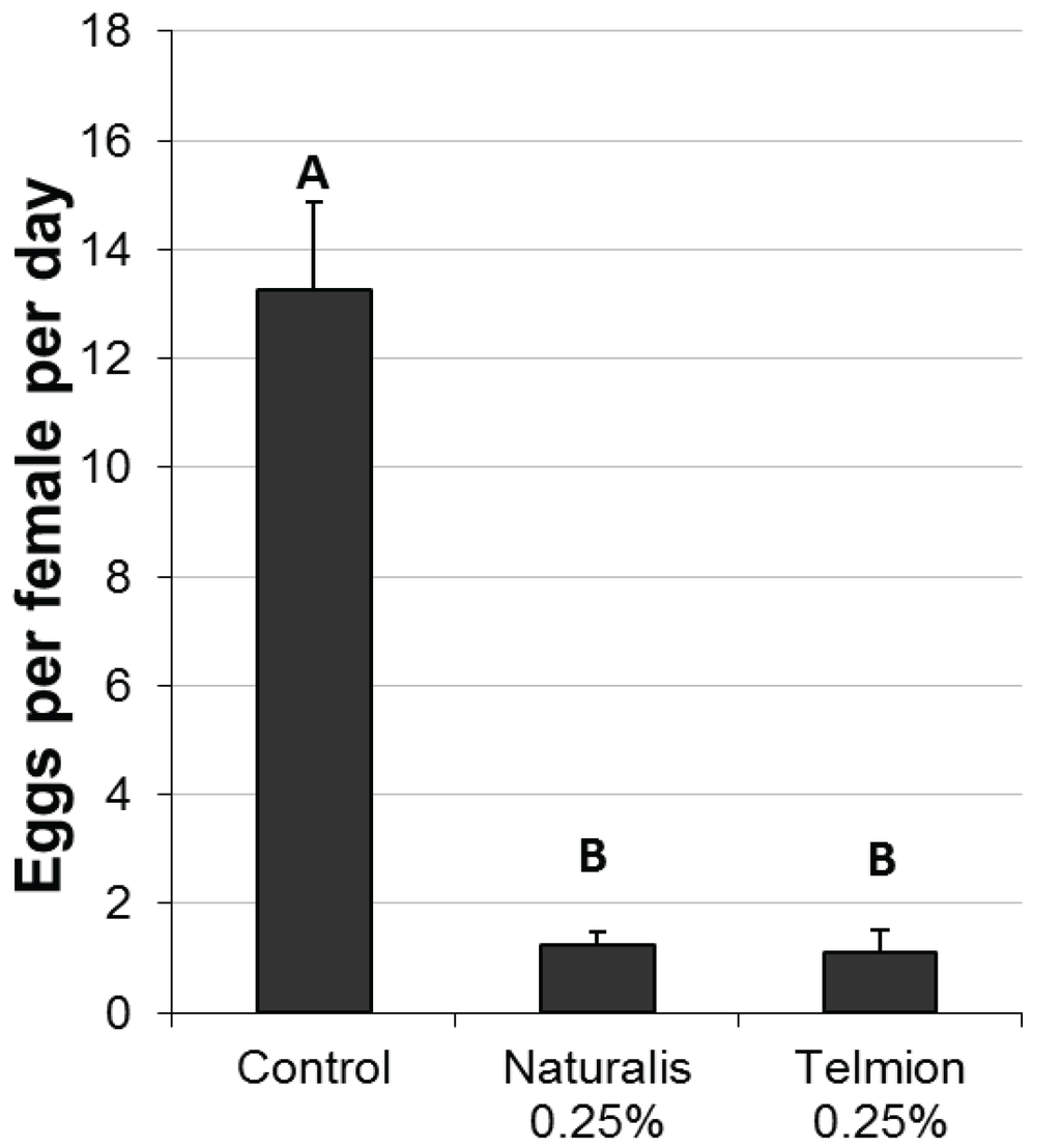 Both treatments significantly reduced oviposition rates per female per day compared to the untreated control. No differences were found between the products Telmion and Naturalis-L (Figure 1, F2,9 = 53.18, p < 0.001).