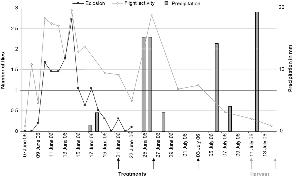 Figure 4 shows the eclosion of flies monitored by photo-eclectors, flight period monitored by yellow sticky traps, the dates of application of treatments and the dates of harvest as well as precipitation during the experimental period.