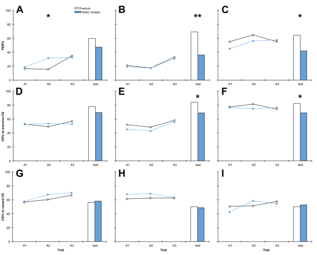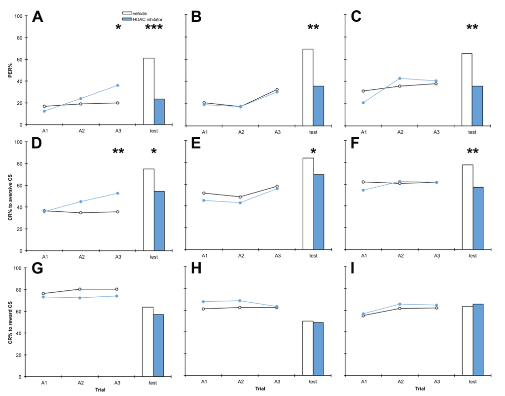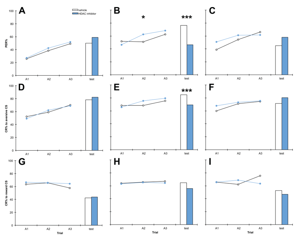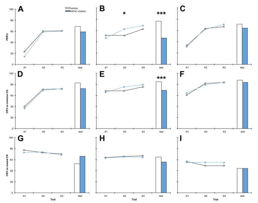 The HDAC inhibitor phenylbutyrate PB) impairs aversive memory at test at 10 mM but not 1 mM or 50 mM. Bees were treated with 1 mM (A, D, G), 10 mM (B, E, H) or 50 mM (C, F, I) C8 or vehicle only, 1 h after training. Panels A–C show discrimination learning and memory, panels D–F show aversive learning and memory and panels G–I show reward learning and memory, during acquisition training (A1,A2,A3) and at the retention test. 1 mM: n PB = 90, n vehicle = 90; 10 mM: n PB = 227, n vehicle = 227; 50 mM n PB = 90, n vehicle = 90. * p < 0.05, *** p < 0.001.