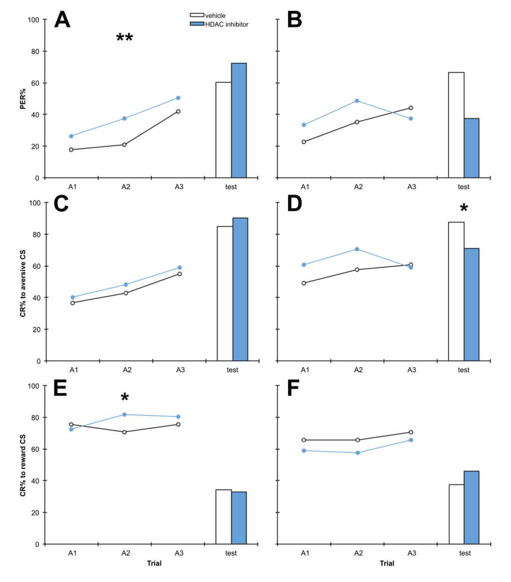 We hypothesise that the impairment of one memory type by HDAC inhibition while another is unaffected could be underpinned by increased histone acetylation upregulating transcription of different memory enhancers and suppressors in the genetic circuitries known to contribute to aversive and reward memory. HDAC inhibitors affect the transcription of only a small and specific subset of genes [57,58], and are thought to improve memory by increasing transcription of genes leading to synaptogenesis and dendritic growth [10,18]. Our results suggest the hypothesis that in the honey bee, HDAC inhibitor treatment increases the expression of genes that suppress aversive memory.