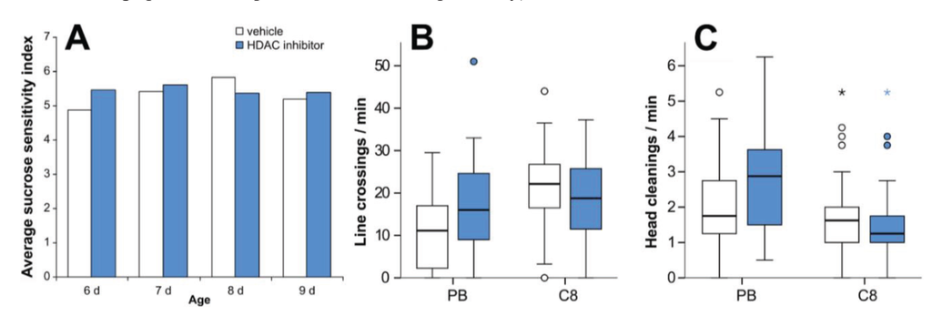 HDAC inhibitor treatment does not affect sucrose sensitivity or locomotor activity. Sucrose sensitivity (A): treatment with an HDAC inhibitor does not significantly alter sucrose sensitivity indices at age 6, 7, 8 or 9 d (p > 0.05). 10 mM C8 was used to test 6, 8 and 9 d bees, 10 mM PB was used to test 7 d bees. Mean sucrose sensitivity indices are shown. From left to right, n HDAC inhibitor = 52, 36, 63 and 40; n vehicle = 56, 56, 60 and 51. Locomotor activity (B, C): bees treated with HDAC inhibitor show no significant change in movement rate (B) or grooming behaviour (C) relative to controls. By experiment, PB: n HDAC inhibitor = 28; n vehicle = 28; C8: n HDAC inhibitor = 37; n vehicle = 38. PB bees were 7 d old, C8 bees were 8 d old. Box plots show medians, quartiles and ranges, with circles and asterisks indicating moderately and strongly outlying data points. No statistically significant effects of PB or C8 treatment were detected on average number of line crossings per minute (p = 0.719, 0.254 respectively) or average number of head cleanings per minute (p = 0.718, 0.197 respectively).
