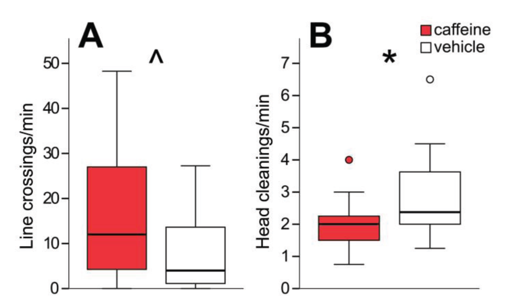 Bees treated with caffeine have increased movement (A) and decreased grooming behaviour (B). By experiment, 7 d: n caffeine = 17, n vehicle = 16. Caffeine-treated bees had significantly fewer head cleanings per minute (p = 0.045) and showed a trend towards increased line crossings per minute (p = 0.074). * p < 0.05, ^ p < 0.10.