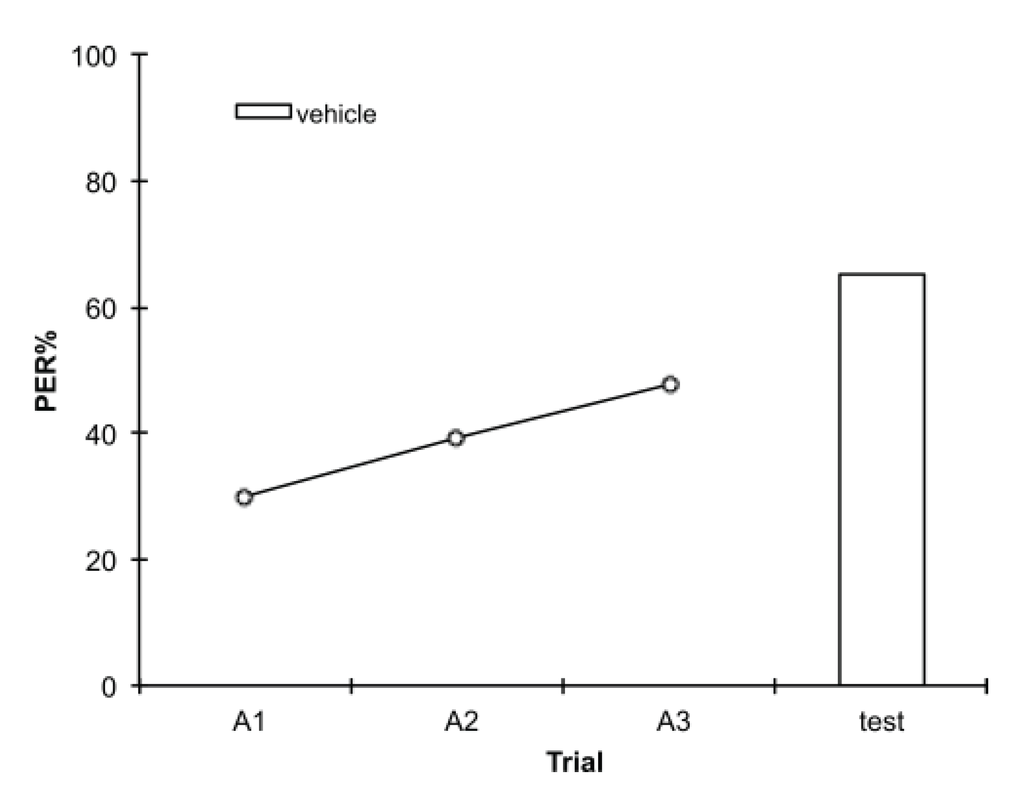 In this version of the proboscis extension reflex (PER) assay, discrimination learning increases linearly during training, and at the 24 h test approximately 2/3 of bees displayed the correct double response, indicating successful discrimination memory. Shown here are control bees from all experiments pooled (n = 902).