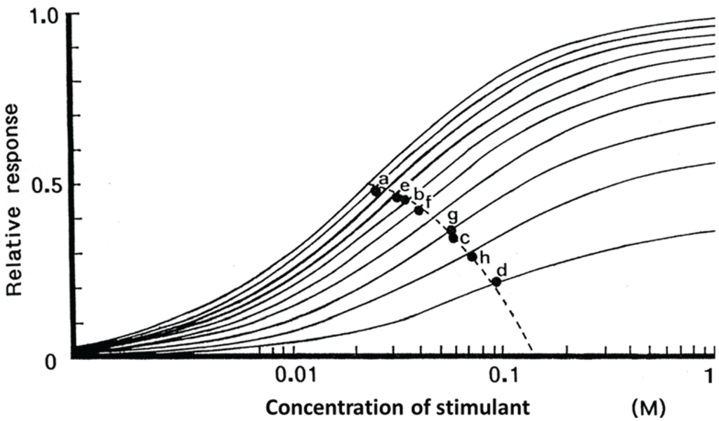 Theoretical concentration-response curves in an adapted single chemoreceptor cell, calculated according to Beidler [91] equation of R/Rm = 1/(1 + C1/2/[S]), where R/Rm is relative response to the maximum response; C1/2 is mid-point concentration; [S] is the concentration of the stimulant. The concentration-response curves are drawn at various adapted states. As the ratio of a receptor activation/inactivation-dependent receptive membrane conductance to leak conductance, (rg/G, where r, number of functional receptor molecule; g, conductance change per activated receptor molecule; G, leak conductance at the receptive membrane) is changed to be 100, 90, 80, 70, 60, 50, 40, 30, 20, and 10% of that at the non-adapted state by sensory adaptation, C1/2 increases and responsiveness of the cell is reduced but the sensory resolution increases, especially for high concentration range. A dotted line follows mid-points of the theoretical concentration-response curves. Experimentally obtained mid-points in a variously adapted sugar taste receptor cell of the blowfly (a–h) are well fitted to the dotted line (Ozaki, unpublished work [92]).