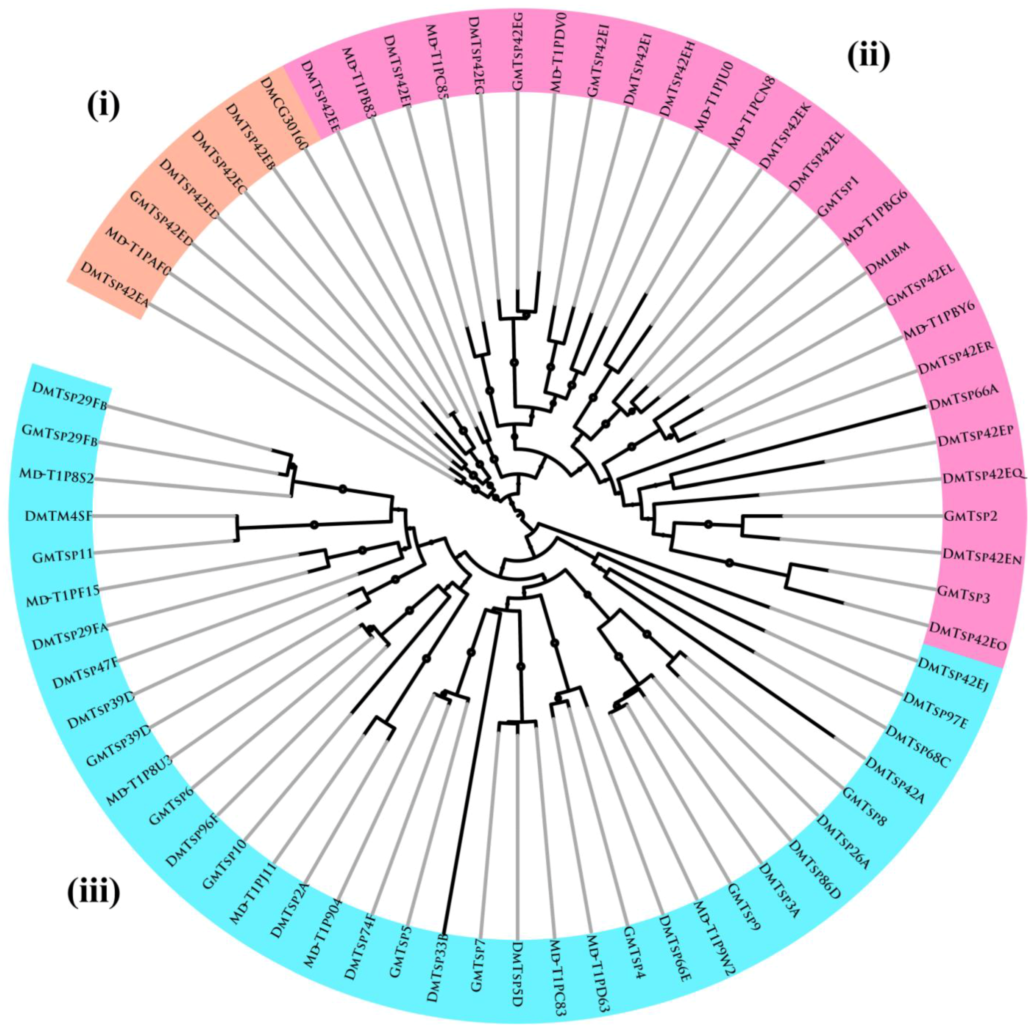 As shown in Figure 3, three distinct clusters were observed: (i) A seven-member cluster consisting of one from G. morsitans (GmTsp42Ed), three from D. melanogaster (DmTsp42Ea, DmTsp42Ed, DmTsp42Ec, DmTsp42Eb and DmCG30160) and one from M. domestica (Md-T1PAF0); (ii) A twenty seven-member cluster with six G. morsitans (GmTsp42Eg, GmTsp42Ei, GmTsp1, GmTsp42EI, GmTsp2 and GmTsp3), fourteen D. melanogaster (DmTsp42Eo, DmTsp42En, DmTsp42Eq, DmTsp42Ep, DmTsp66A, DmTsp42Er, Dmlbm, DmTsp42El, DmTsp42Ek, DmTsp42Eh, DmTsp42Ei, DmTsp42Eg, DmTsp42Ef and DmTsp42Ee) and seven M. domestica (Md-TIPB83, Md-TIPC85, Md-TIPDV0, Md-TIPJU0, Md-TIPCN8, Md-TIPBG6 and Md-TIPBY6); (iii) A thirty five-member cluster made up of nine G. morsitans tetraspanins (GmTsp11, GmTsp39D, GmTsp6, GmTsp10, GmTsp5, GmTsp7, GmTsp4, GmTsp9 and GmTsp8), eighteen D. melanogaster (DmTsp29Fb, DmTM4SF, DmTsp29Fa, DmTsp47F, DmTsp39D, DmTsp96F, DmTsp2A, DmTsp74F, DmTsp33B, DmTsp5D, DmTsp66E, DmTsp3A, DmTsp86D, DmTsp26A, DmTsp42A, DmTsp68C, DmTsp97E and DmTsp42Ej) and eight M. domestica tetraspanins (Md-T1P8S2, Md-T1PF15, Md-T1P8U3, Md-T1PJ11, Md-T1P904, Md-T1PC83, Md-T1PD63 and Md-T1P9W2).