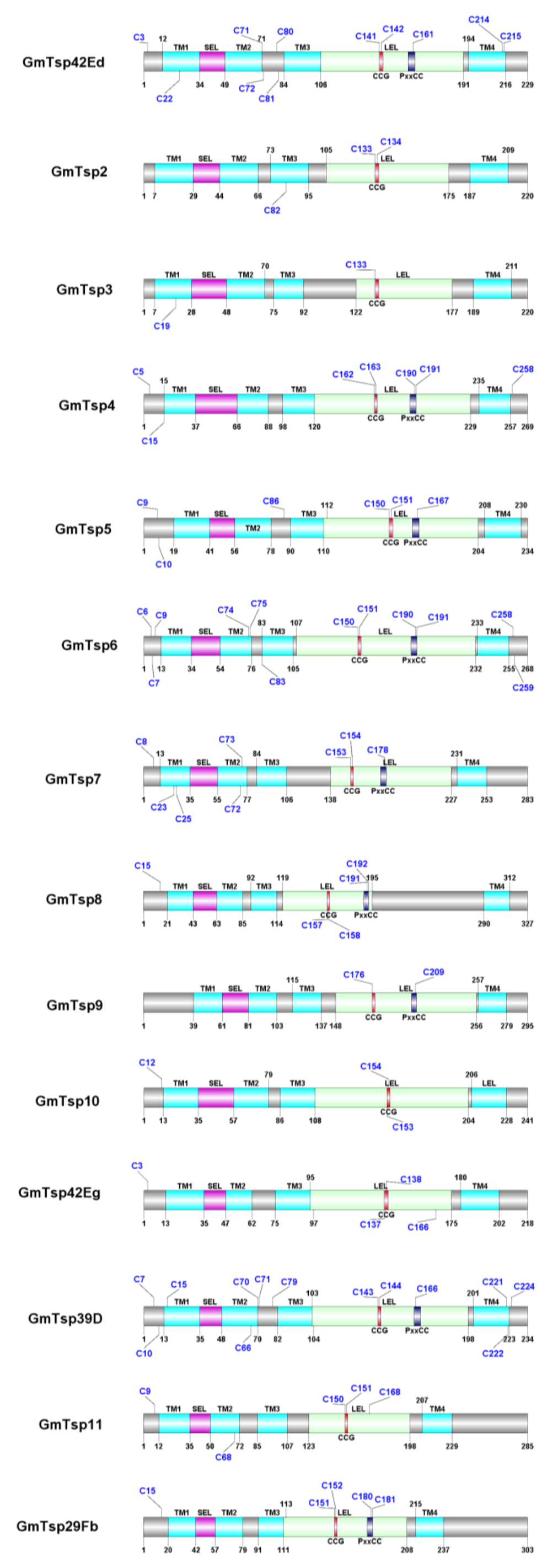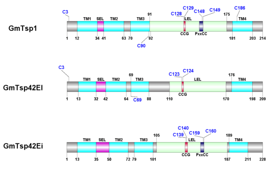 | GmTsp42Eg | D3TQ76 | 218 | 95–176 | 13–35, 40–62, 75–97, 180–202 |