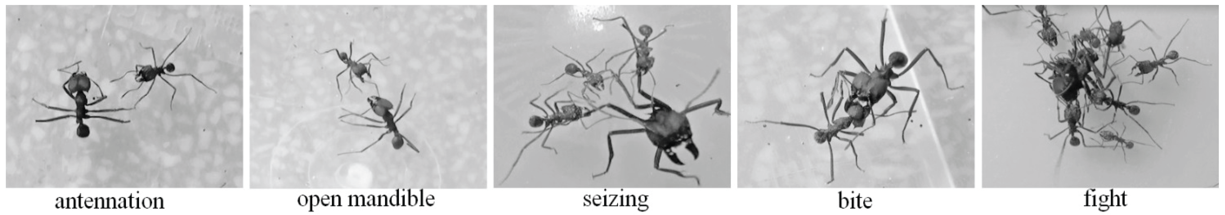 The behavioral responses of resident workers towards an introduced subject were noted using an adapted version of a five-point scale [23]: 1—antennation; 2—opened mandibles; 3—seizing; 4—bites; and 5—fights (Figure 1).