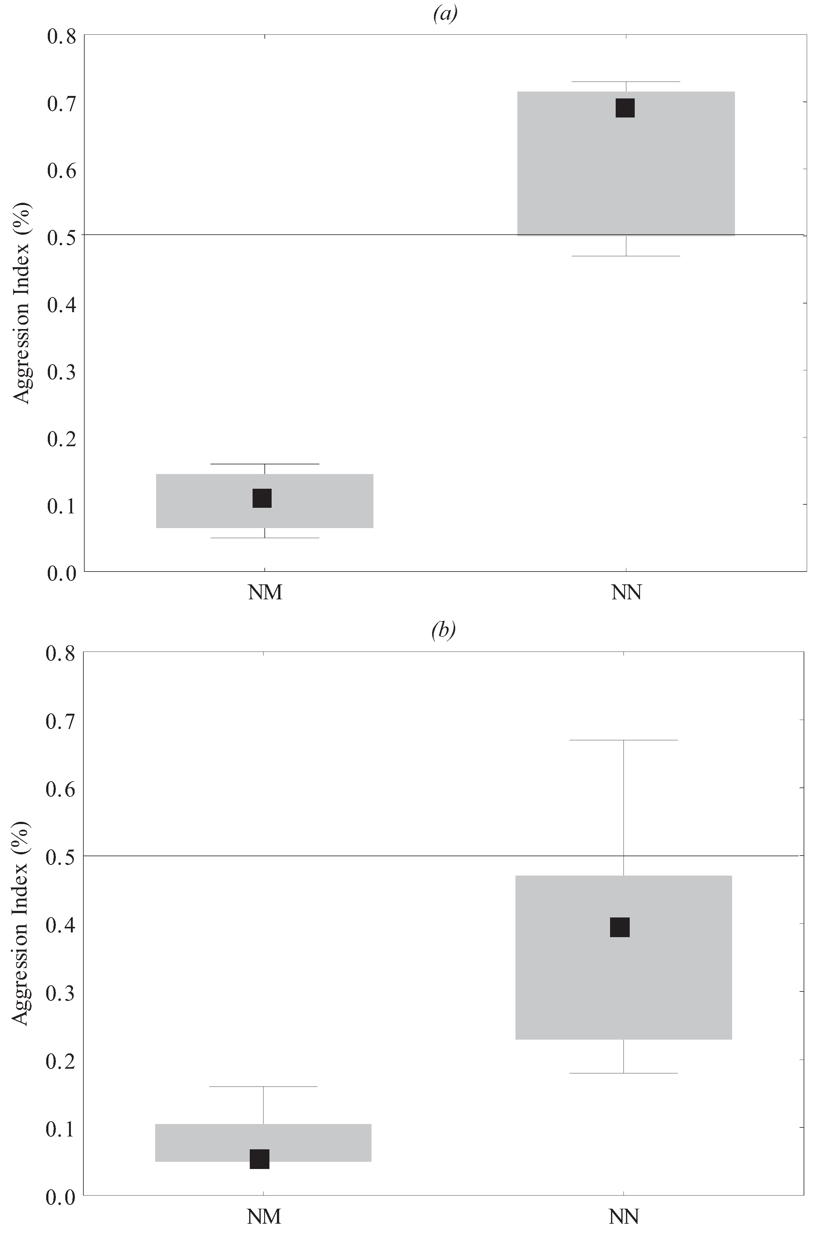 Frequency of aggression indexes between colonies from group-A vs. group-B at (a) Phase I and (b) Phase II. NM = nestmates; NN = non-nestmates. Black dots = mean; gray boxes = standard error; whiskers = standard deviation.