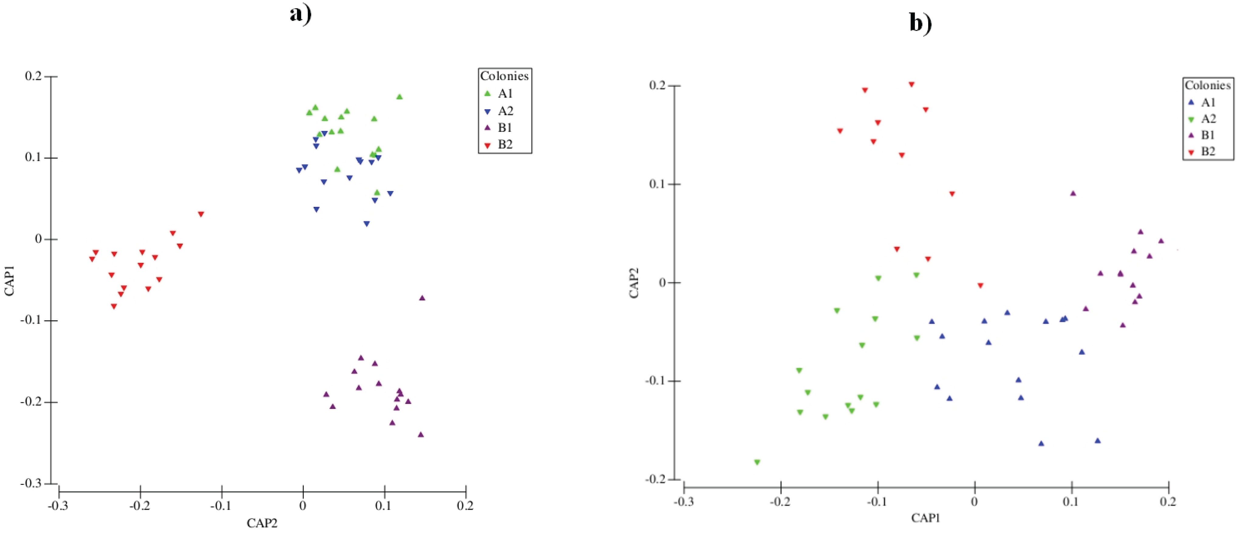 Result of canonical analysis of principle coordinates carried out with cuticular hydrocarbons of four Atta sexdens colonies at (a) Phase I and (b) Phase II.