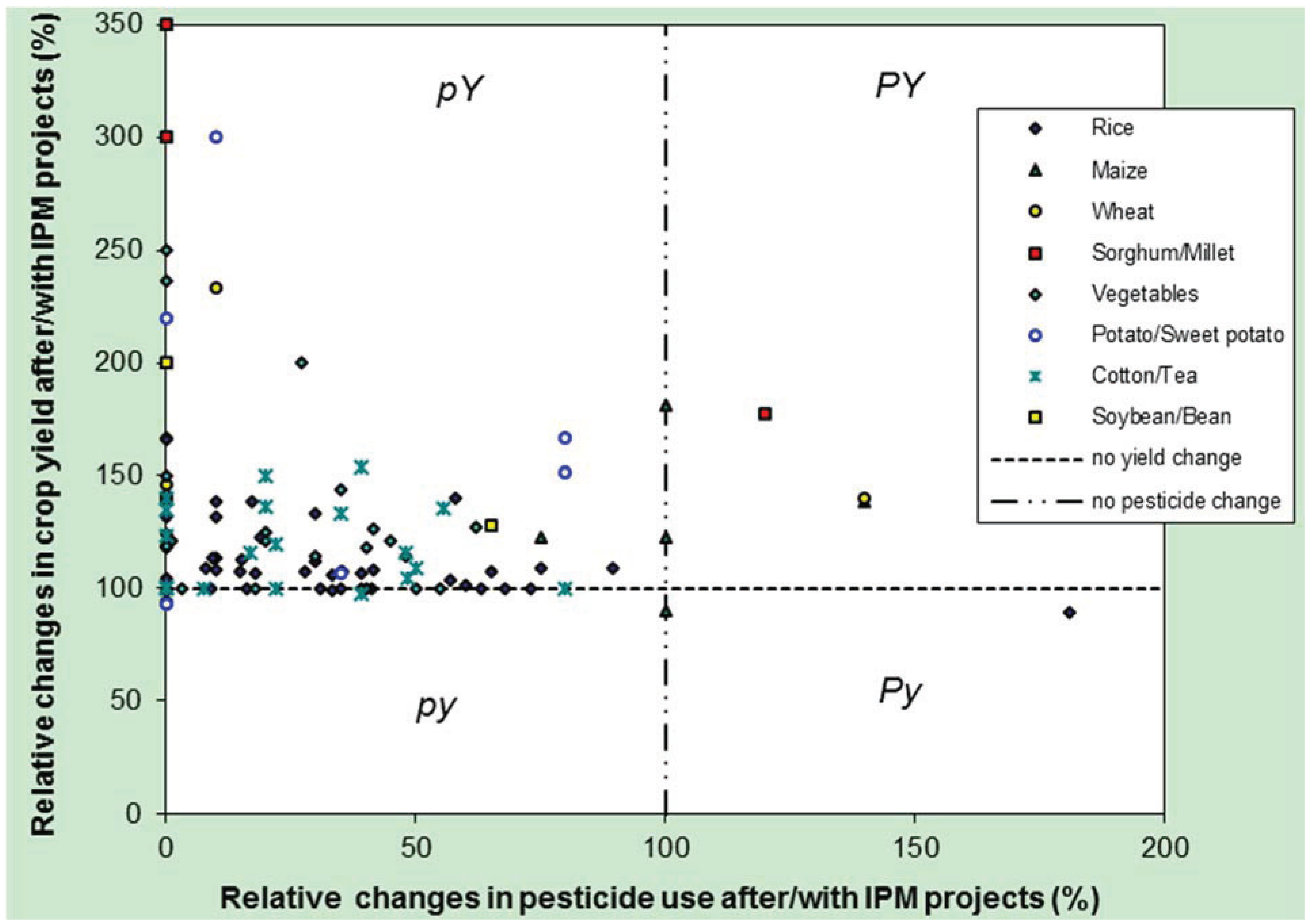 Integrated Pest Management (IPM) is a leading complement and alternative to synthetic pesticides and a form of sustainable intensification with particular importance for tropical smallholders. Global pesticide use has grown over the past 20 years to 3.5 billion kg/year, amounting to a global market worth $45 billion. The external costs of pesticides are $4–$19 (€3–15) per kg of active ingredient applied, suggesting that IPM approaches that result in lower pesticide use will benefit, not only farmers, but also wider environments and human health. Evidence for IPM’s impacts on pesticide use and yields remains patchy. We contribute an evaluation using data from 85 IPM projects from 24 countries of Asia and Africa implemented over the past twenty years. Analysing outcomes on productivity and reliance on pesticides, we find a mean yield increase across projects and crops of 40.9% (SD 72.3), combined with a decline in pesticide use to 30.7% (SD 34.9) compared with baseline. A total of 35 of 115 (30%) crop combinations resulted in a transition to zero pesticide use. We assess successes in four types of IPM projects, and find that at least 50% of pesticide use is not needed in most agroecosystems. Nonetheless, policy support for IPM is relatively rare, counter-interventions from pesticide industry common, and the IPM challenge never done as pests, diseases and weeds evolve and move.