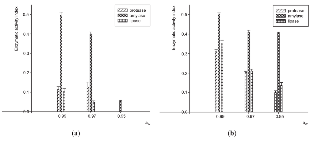 It is also important to compare if these optimum conditions match the increasing enzyme production. In this study, the greater growth rate was in presence of gelatin as substrate at the higher and lower Aw tested. On the other hand, both strains showed lower growth rates in the culture medium supplemented with tween-20 tested at 3 Aw. Both strains showed an acceptable growth rate with starch, probably because these strains are adapted to remain in the soil during the stages that not parasitize insects [].