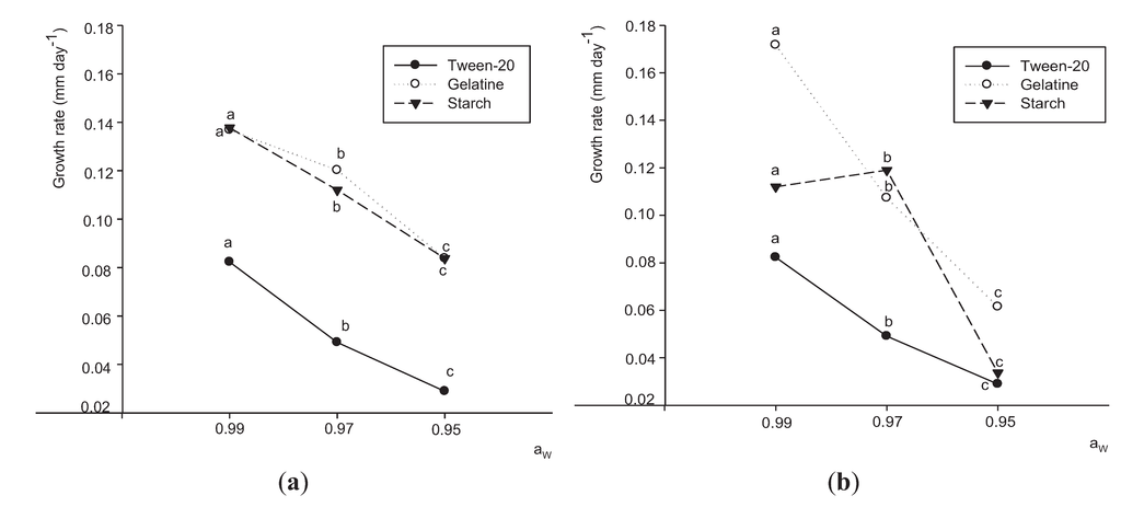 Changes in growth rate of both strains in relation to Aw level and different substrates at 25 °C are shown in Figure 2. The major effect was that of Aw (F = 120.17; P < 0.0001). The growth rate of both strains was inhibited with decreasing Aw. Apart from this, both strains showed lower growth rates in the culture medium supplemented with tween-20. The strain JQ926223 showed a greater growth rate in presence of gelatine as substrate at the highest and lowest Aw tested. However, at 0.97 Aw, the growth rate was greater in presence of starch. The opposite was observed for strain JQ926212 in presence of gelatine and starch. It was observed that strain JQ926223 was more sensitive to changes of Aw for all substrates. A reduction of about 40% was observed when the fungus grew on the medium with gelatine in the Aw range of 0.99–0.97 and 0.97–0.95 Aw.