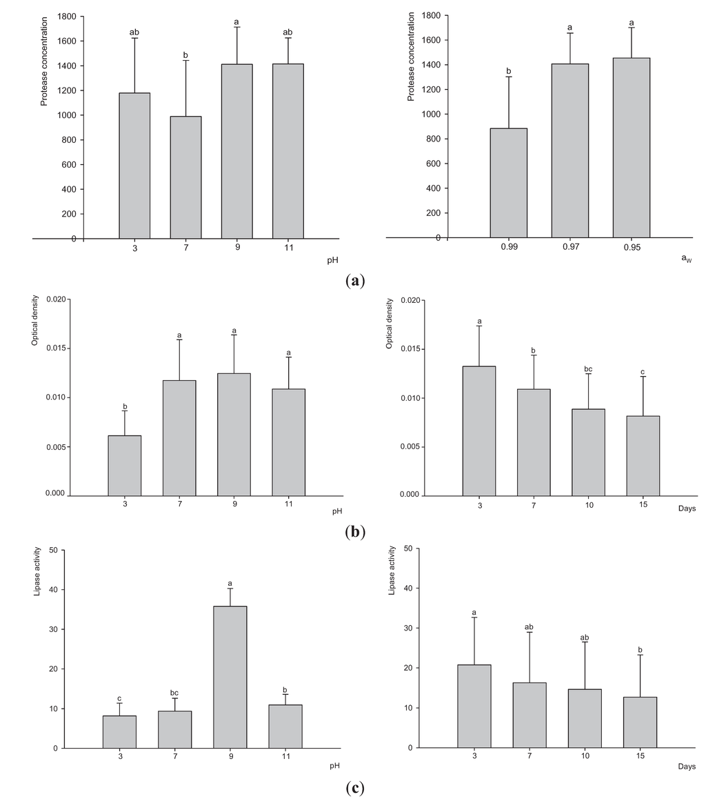 The determination of the optimal conditions for the production of higher yields of extracellular enzymes was carried out by analyzing the influence of factors, such as pH, Aw and incubation time. No significant differences between strains (F = 0.05; P = 0.8301) were observed; thus Figure 3 summarizes the effect of different factors on the two fungal strains. Moreover, no effect was observed for incubation time for protease activity or for Aw for amylase and lipase activities. Therefore, the effect of these two factors is not shown. The maximum protease concentration was achieved at alkaline and acidic pH and in the range of 0.97–0.95 Aw (Figure 3a). The pH (F = 23.29; P < 0.0001) and incubation time (F = 14.88; P < 0.0001) were the two factors that affected the amylolytic production the most. The optimum pH range for the production of amylases was alkaline. A good yield at neutral pH was also obtained. The maximum amylase production was obtained at the shortest incubation time (Figure 3b). Lipase production was affected by incubation time (F = 106.1; P < 0.0001) and pH (F = 343.1; P < 0.0001). The greatest amount of these enzymes was obtained after 3 days of incubation and pH 9 (Figure 3c).