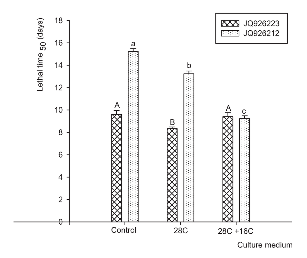 LT50 for T. confusum adults exposed during 15 days to two strains of P. lilacinum JQ926212 and JQ926223 grown in control medium and amended medium with 28C and 28C + 16C mixture. Data with different letters for each strain (JQ926223: capital letters, JQ926212: small letters) at different treatments are significantly different based on the Tukey test (P < 0.05).