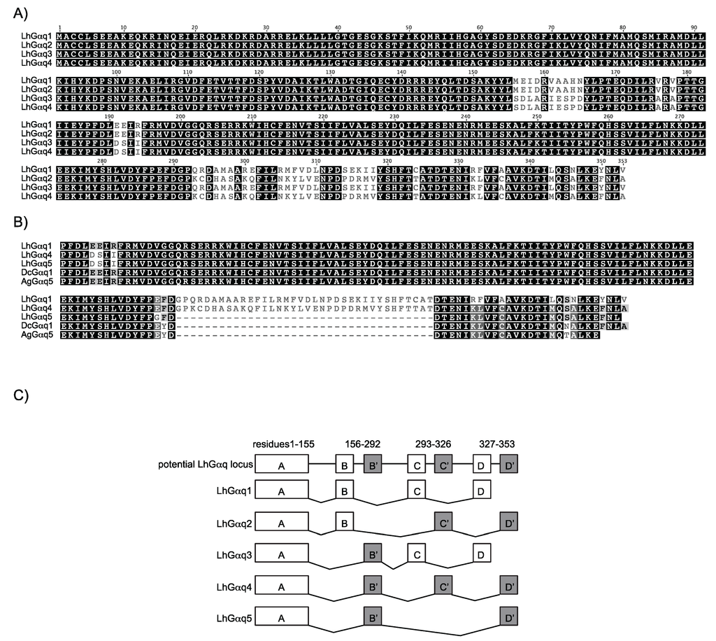 To identify Gα proteins expressed in L. hesperus (LhGα), we initially utilized a homology-based approach with degenerate primers designed to conserved regions of Gα proteins and both PCR and nested PCR conditions. Sequence analysis indicated amplimers of the expected sizes were partial fragments of proteins homologous with Gαs, Gαi, and Gαq proteins. Further extension of the partial sequences using conventional RACE PCR methods identified putative start and stop codons. Primers designed to those regions facilitated amplification of the respective open reading frames (ORFs). Based on sequence similarities with known Gα subunits (Table 2), we designated the cloned sequences as LhGαi, LhGαs, and LhGαq. The 1230 nt LhGαi transcript contains a 1068 nt ORF encoding a 355 amino acid residue protein, whereas the 1538 nt LhGαq transcript encompasses a 1062 nt ORF encoding a protein containing 353 amino acids. The 1350 nt LhGαs transcript has a 1137 nt ORF encoding a 378 amino acid protein. The predicted molecular masses of the three Gα proteins (LhGαi = 40.6 kDa, LhGαs = 44.2 kDa, and LhGαq = 41.5 kDa) are comparable with previous reports [3].