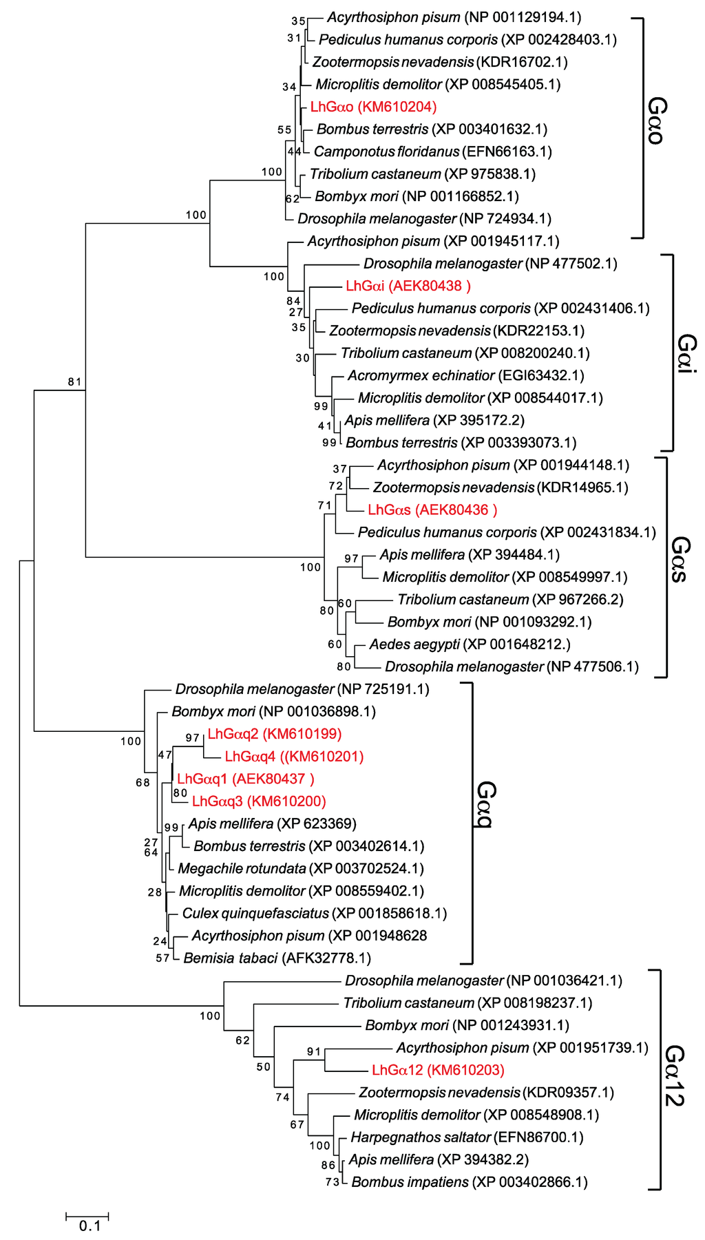 LhGα sequences were evaluated against the NCBI nr database by BLASTx (E value ≤ 10−5). Putative myristoylation sites were predicted using NMT-MYR Predictor (http://mendel.imp.ac.at/myristate/SUPLpredictor.htm) and palmitoylation sites with CSS-PALM (http://csspalm.biocuckoo.org/index.php) [64]. To determine potential phylogenetic relationships, multiple sequence alignments of the putative LhGα subunits and other insect Gα subunits (nine per subfamily) were constructed using default settings in MUSCLE [65,66]. Phylogenetic inferences were made using the maximum likelihood, minimum evolution, NJ, and UPGMA modules implemented in MEGA6.06 [67] with bootstrap analysis conducted of 1000 replicates. Data shown are for the maximum likelihood method based on the JTT matrix-based model [68]. Initial tree(s) for the heuristic search were obtained by applying the NJ method to a matrix of pairwise distances estimated using a JTT model. The analysis involved 53 amino acid sequences. All positions containing gaps and missing data were eliminated. There were a total of 350 positions in the final dataset.