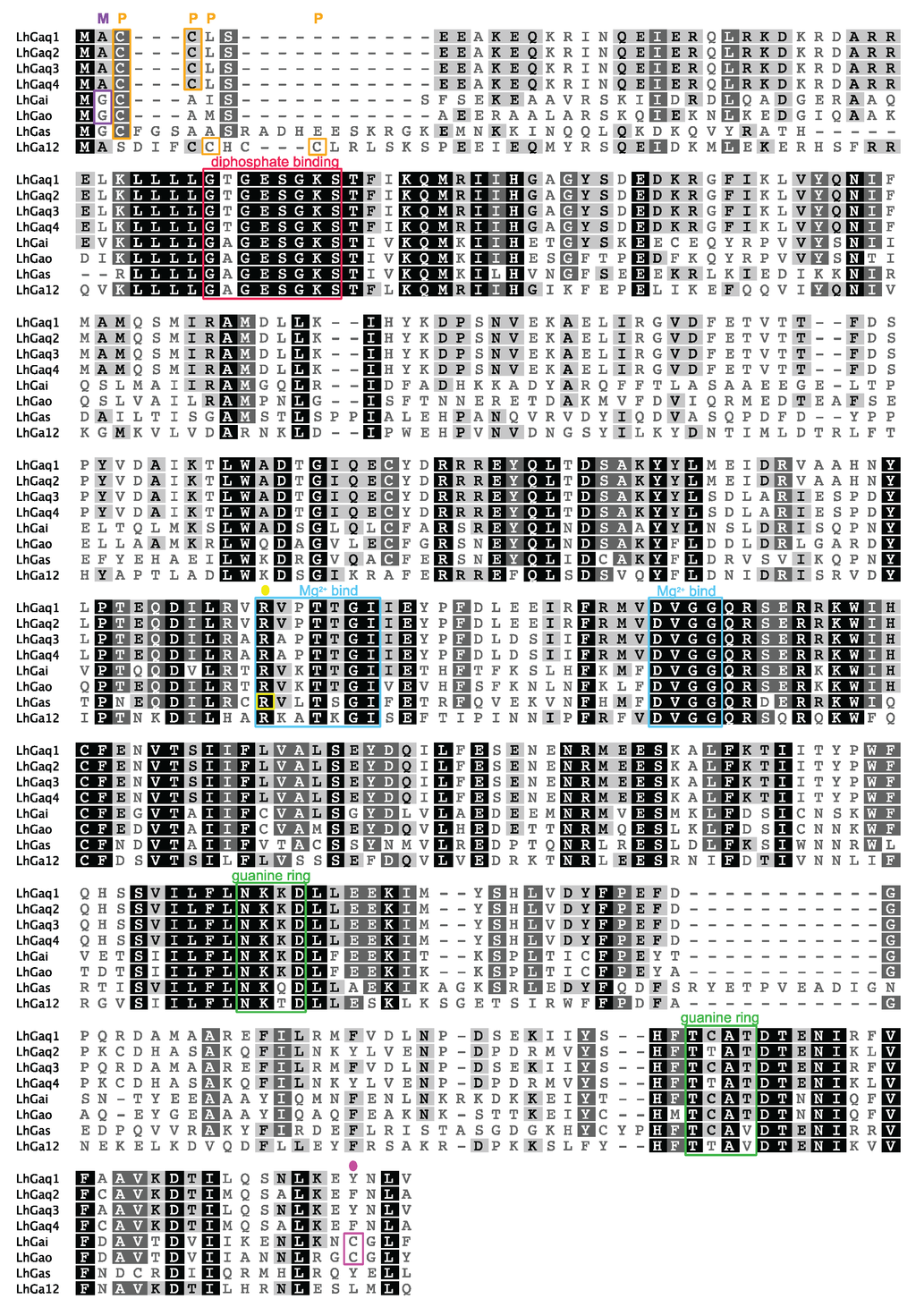 The Gα subunits form a large multigene family composed of 39–52 kDa proteins that share 35%–95% sequence identity and have been grouped into four subfamilies (Gαs, Gαi/o, Gαq, and Gα12) based on structural and functional similarities [1,2,3]. Gαs subfamily members couple receptors to adenylyl cyclase stimulation (i.e., increases in cAMP), whereas the Gαi/o subfamily has the opposite effect. The Gαq subfamily regulate the activity of phospholipase C β isoforms (i.e., diacylglycerol and inositol triphosphate production) [1,2] and Gα12 has been extensively characterized based on their ability to activate Rho-specific guanine nucleotide exchange factors [4,5].