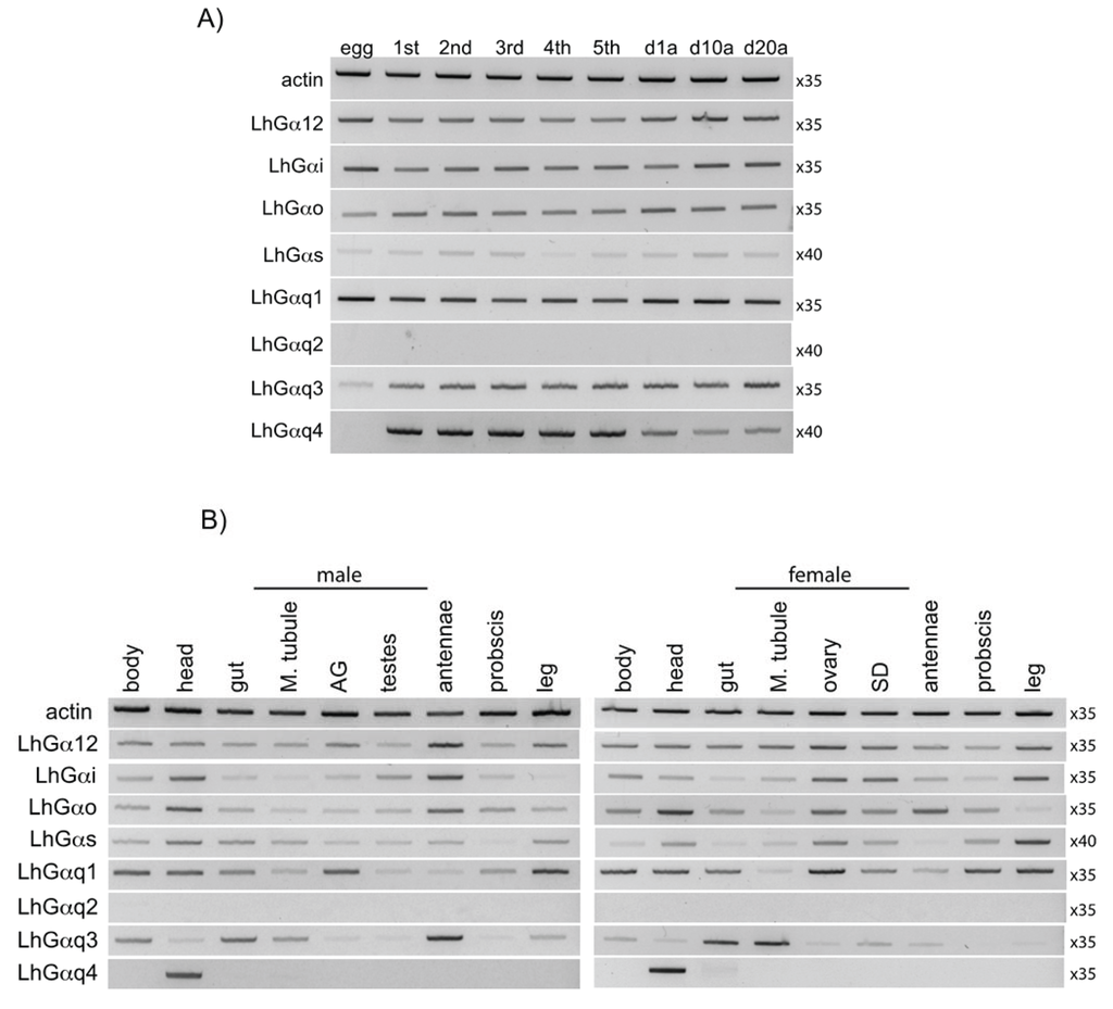 End point PCR-based expression profile of L. hesperus Gα transcripts. (A) Expression profile of LhGα sequences in eggs, nymphal development (1st–5th instars), 1-day-old mixed sex adults (d1a), 10-day-old mixed sex adults (d10a), and 20-day-old mixed sex adults (d20a); (B) Expression profile of LhGα sequences in sex-specific adult tissues. Abbreviations are: M. tubule, Malpighian tubule; AG, accessory glands (lateral and medial); SD, seminal depository. In both (A) and (B), amplimers correspond to ~500-600 bp fragments of each transcript with products analyzed on 1.5% agarose gels stained with SYBR Safe. Negative images of the gels are shown for enhanced clarity of low expression transcripts. Numbers to the right of each gel image indicate the number of amplification cycles.