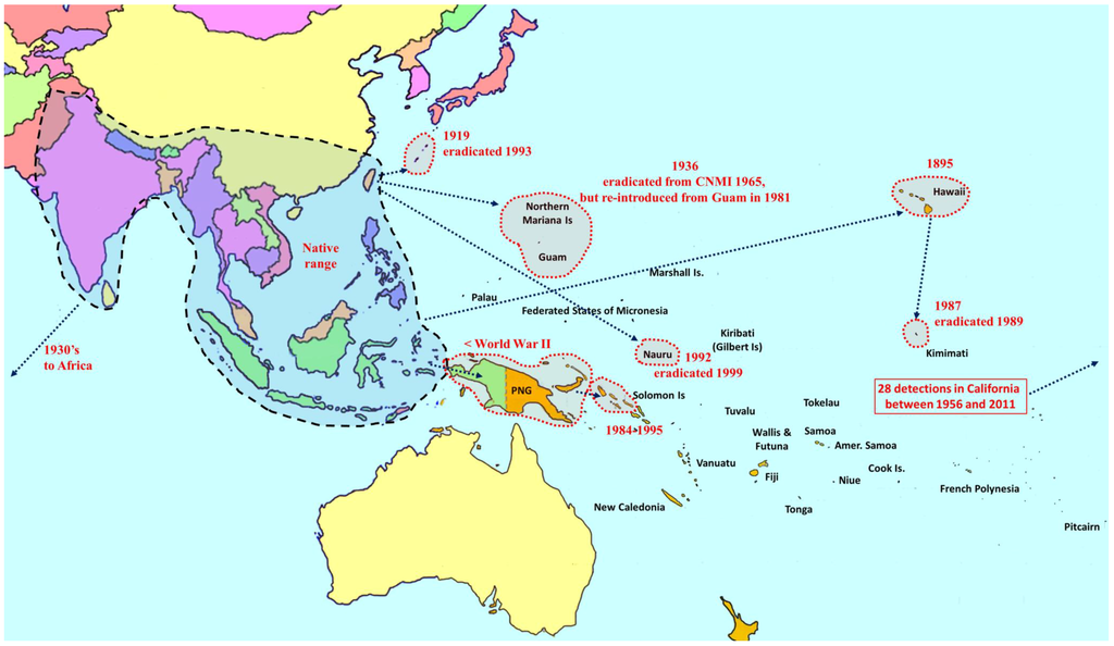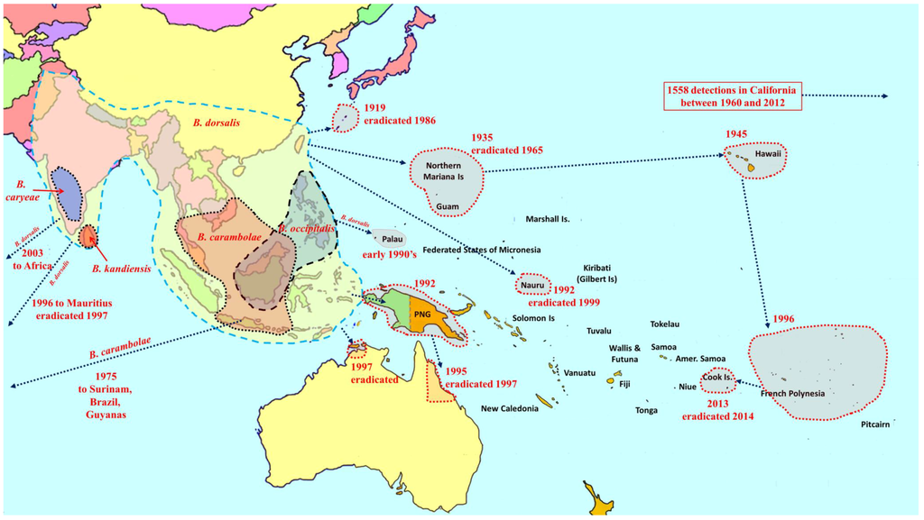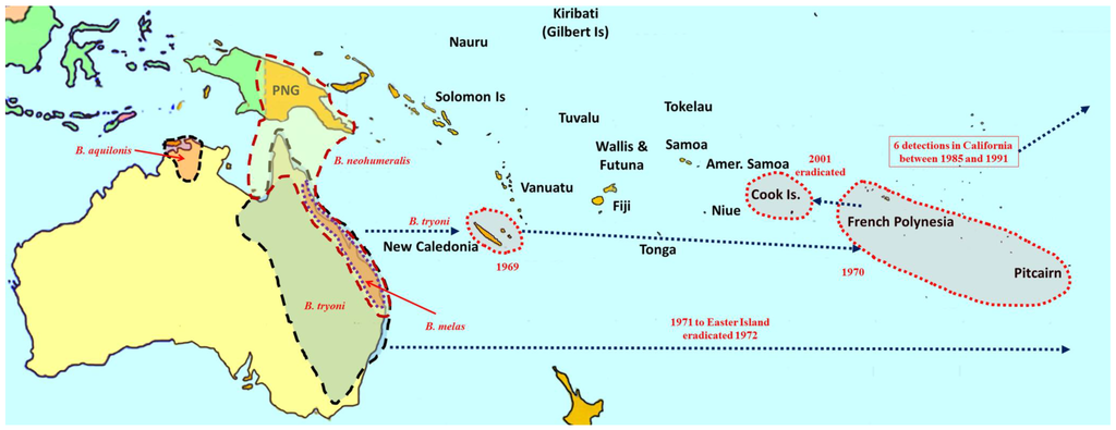Among the most destructive Category A species are B. dorsalis (oriental fruit fly), B. cucurbitae (Coquillett) (melon fly) and B. tryoni (Froggatt) (Queensland fruit fly). The B. dorsalis complex is a large group composed of 85 species [14,16,20], of which five are polyphagous fruit pests (Figure 1). Recently, B. philippinensis Drew and Hancock was declared a synonym of B. papayae Drew and Hancock [16], and the latter was in turn, along with B. invadens, declared a synonym of B. dorsalis [21]. This regrouping has greatly increased the geographic range of B. dorsalis. Two of the most destructive species in the complex (B. dorsalis and B. carambolae) have invaded and become established in the Pacific region, Africa, South America, and debatably in California [22,23] (Figure 1). Bactrocera cucurbitae is primarily a pest of cucurbits, and females can infest unripe fruit and flowers. It is also a pest of papaya and infrequently infests other non-cucurbit hosts as well. It is native to Southeast Asia, and was introduced into Africa and parts of Oceania (Figure 2). The B. tryoni complex is composed of four very closely related species. While Queensland fruit fly (B. tryoni) and the lesser Queensland fruit fly (B. neohumeralis (Hardy)), both sympatric, are genetically indistinguishable, yet reproductively isolated by time of mating (dusk for the former and day time for the latter), B. aquilonis (May) and B. melas (Perkins & May) may be conspecific variants of B. tryoni [24]. In the early 1970s, B. tryoni was introduced and became established in New Caledonia and French Polynesia (Figure 3).