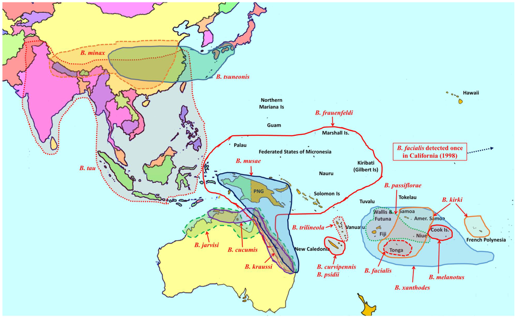 | B. frauenfeldi (Schiner) | Polyphagous fruit pest | Australia, Micronesia (except Marianas), New Guinea, Solomon Islands. |