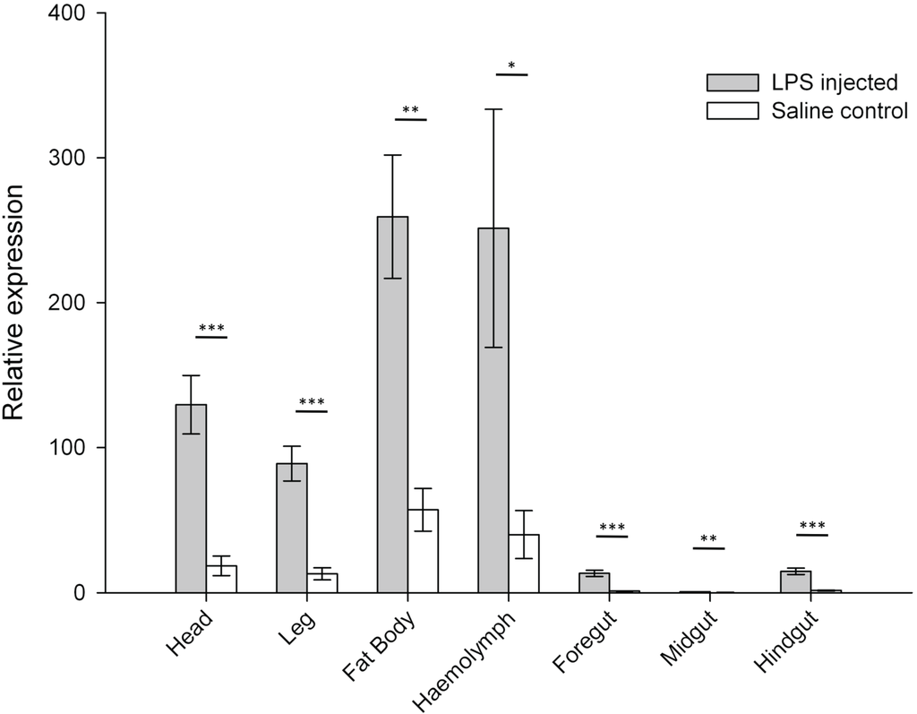 Relative expression levels of saline control and LPS-injected Locusta migratoria for the immune gene encoding peptidoglycan recognition protein SA (PGRP-SA) in seven tissue types. * p < 0.05; ** p < 0.01; *** p < 0.001. Error bars = ± SEM.