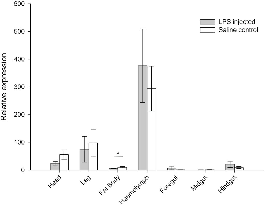 Activation of innate immunity has been classically measured in targeted tissues such as the haemolymph and fat body. Limited information exists on immune activation in other body parts, however, such knowledge may not only provide a better understanding of insect physiology in the context of infection, but also allow identification of tissue types that are potentially more informative for the interpretation of insect immunity (see for instance [9]). In the present study, we used reverse transcription quantitative polymerase chain reaction (RT-qPCR) to follow and compare the expression of three immune-related genes across seven tissues in saline- and LPS-injected locusts.