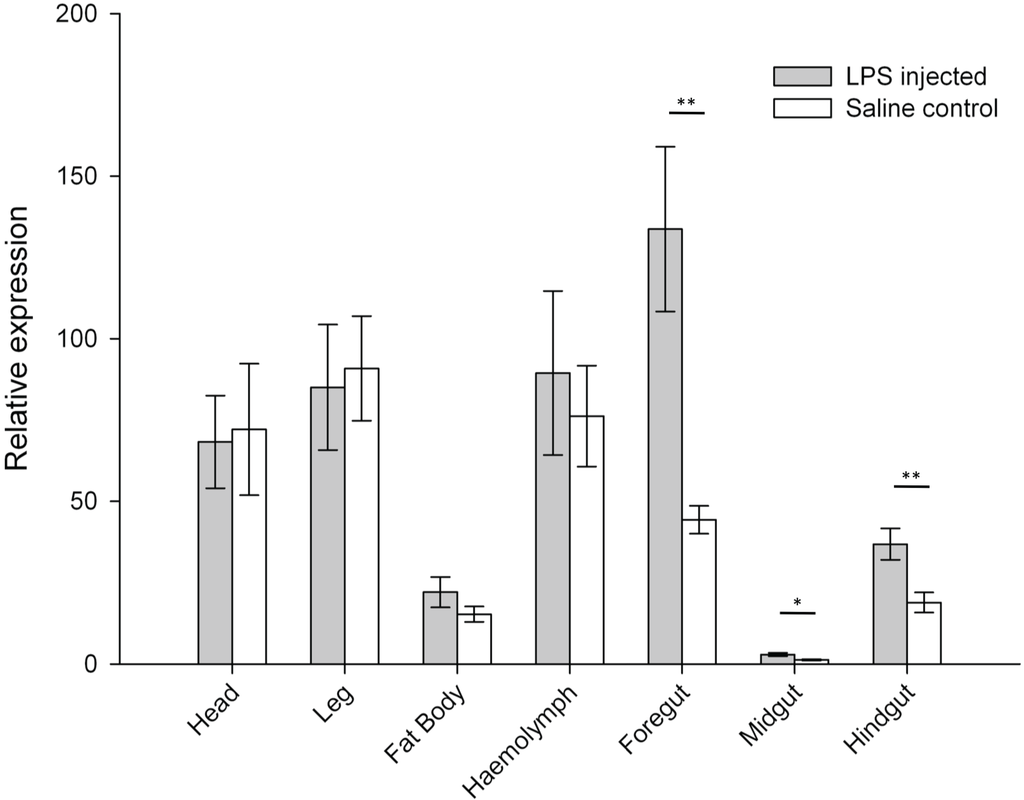 We found a similar pattern of variation for both treatments, with expression levels being greater in the haemolymph, head and leg, and lower in the foregut and midgut (Figure 2). Expression levels of the gene coding for prophenoloxidase (ProPO) were significantly affected by the LPS immune challenge in all three gut segments, with increases in ProPO expression in LPS-challenged insects compared to saline controls (Figure 3). No effects of LPS-injection were detected in the other body parts (Figure 3).